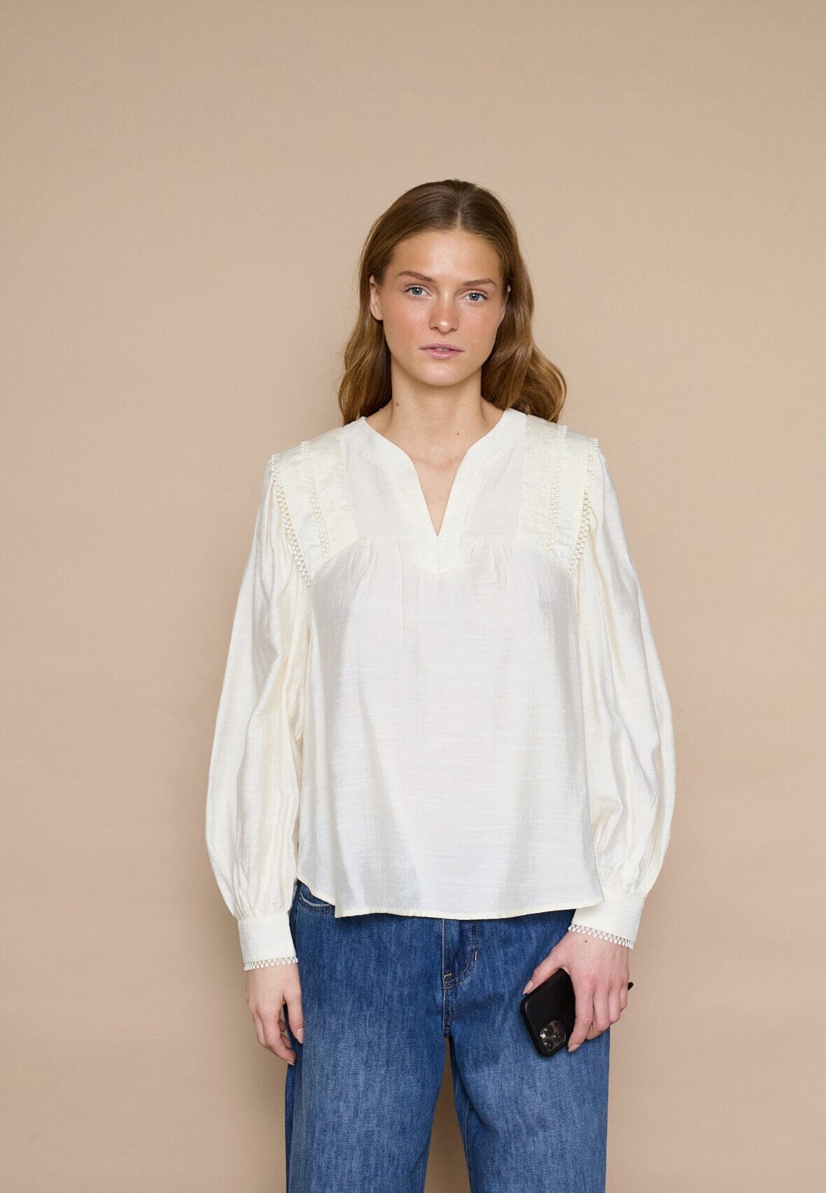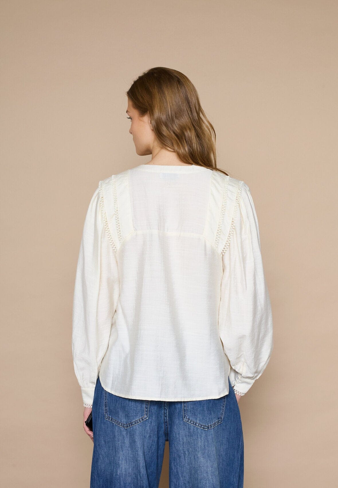 Crèmefärgad blus från Love & Divine med lös passform och långa ärmar. Blusen har V-ringning och dekorativa volangdetaljer på axlarna och manschetterna.