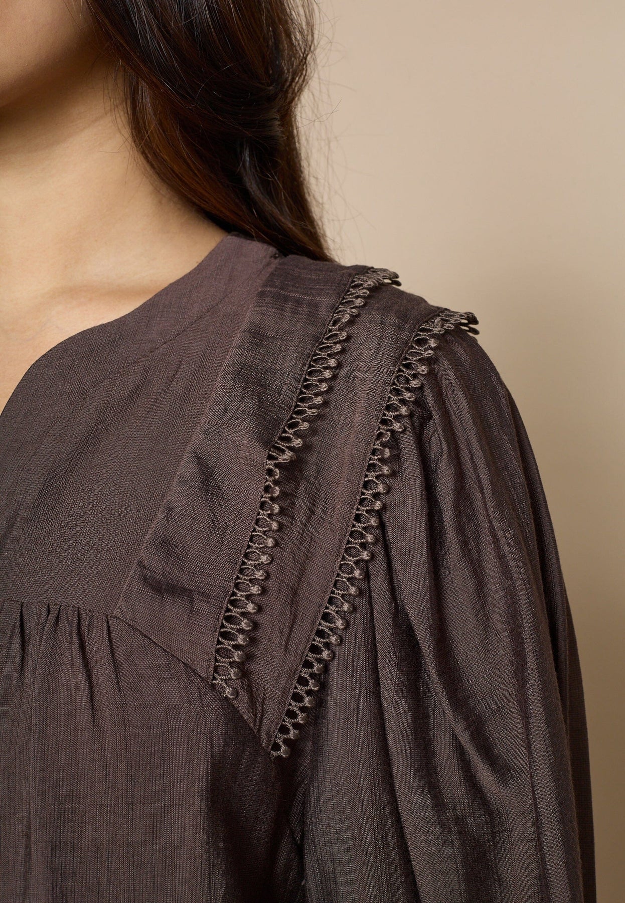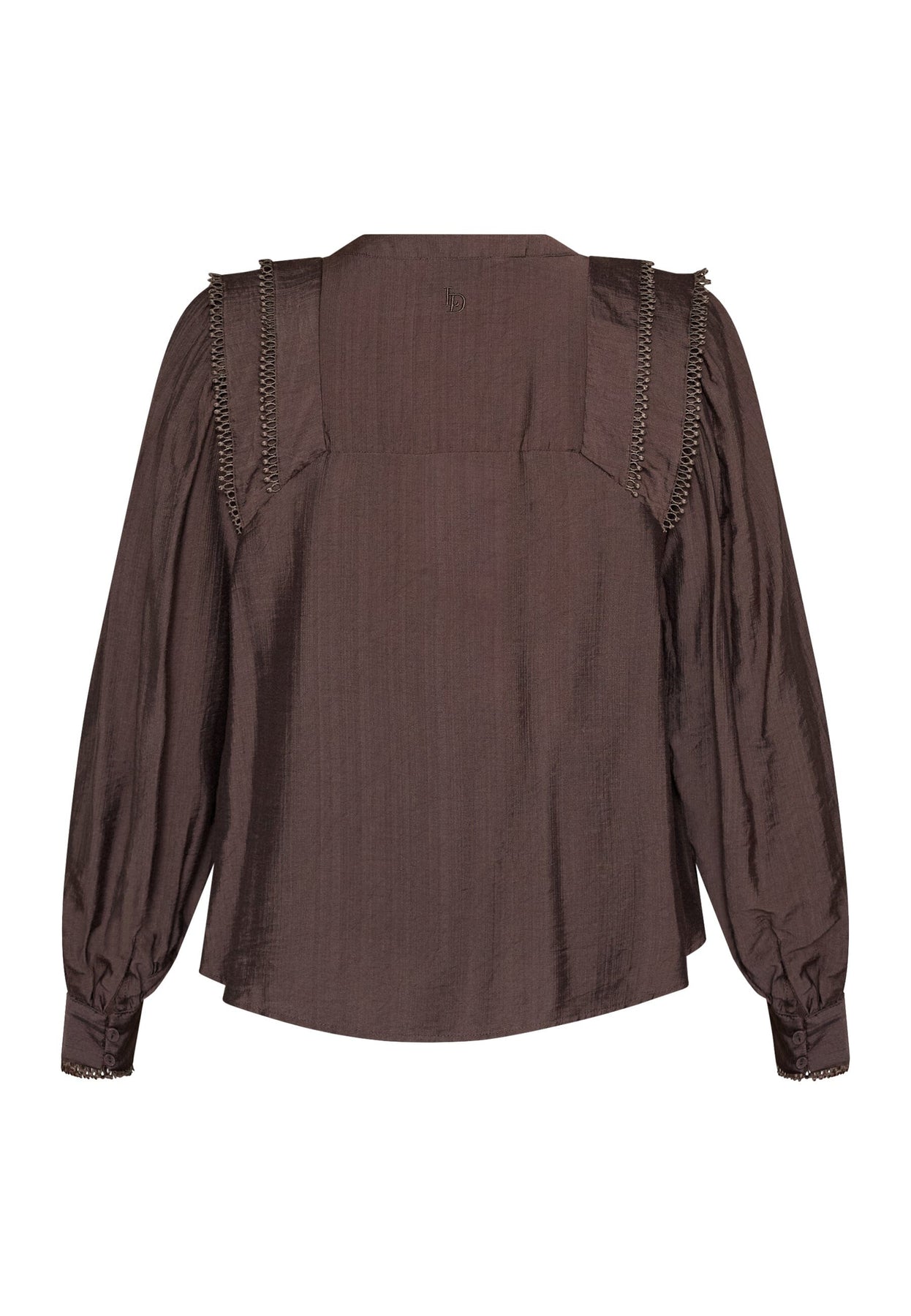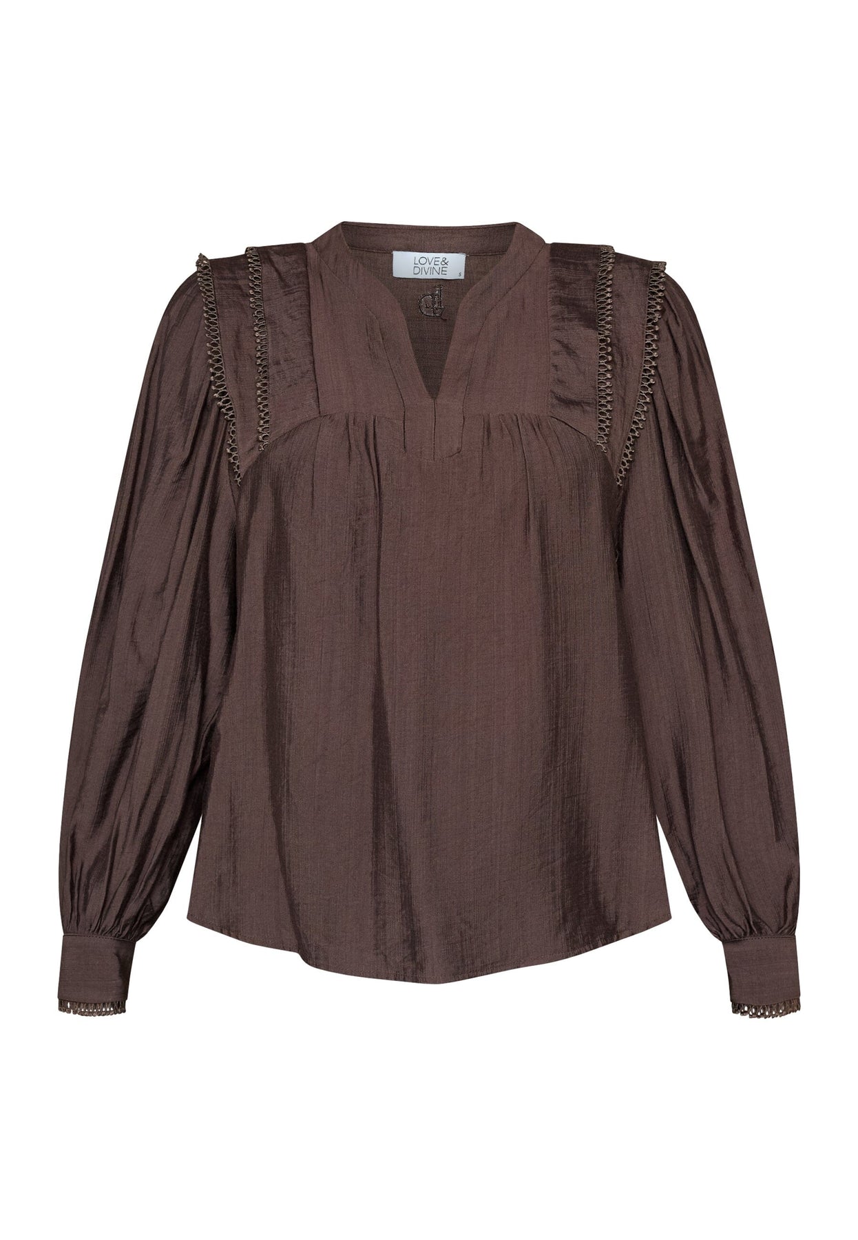 Mörkbrun blus från Love & Divine, tillverkad av en blandning av viskos och polyamid. Blusen har V-ringning och långa ärmar.