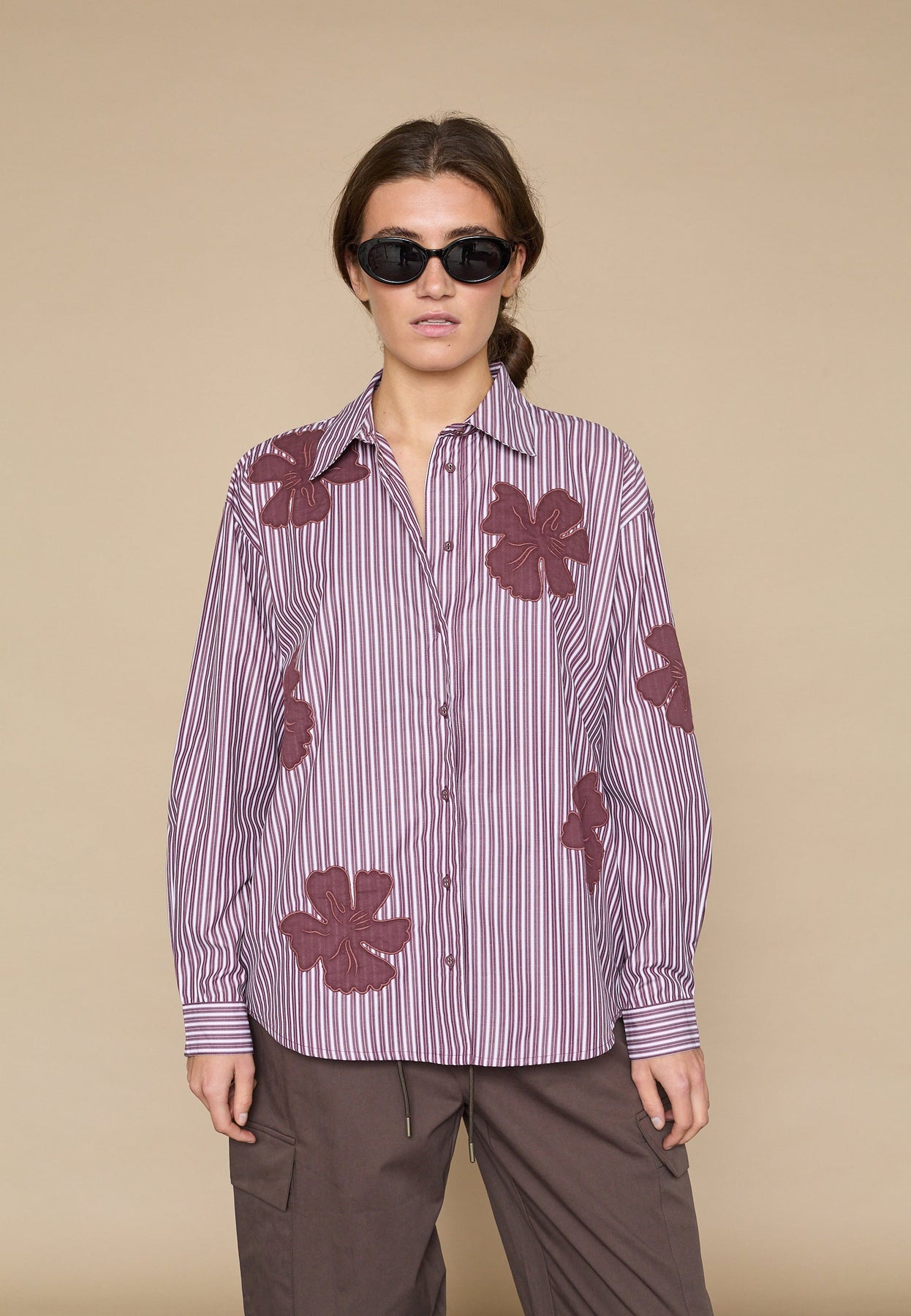 Randig skjorta från Love & Divine med stora blomsterapplikationer i bordeaux. Skjortan har klassisk krage och knapplåsning.