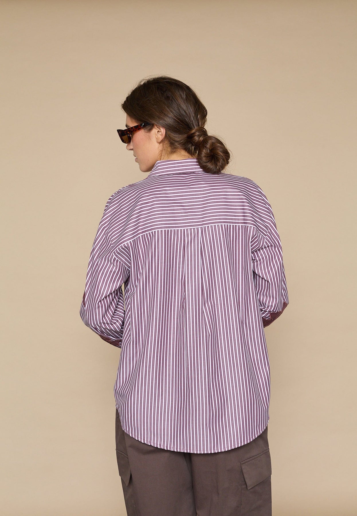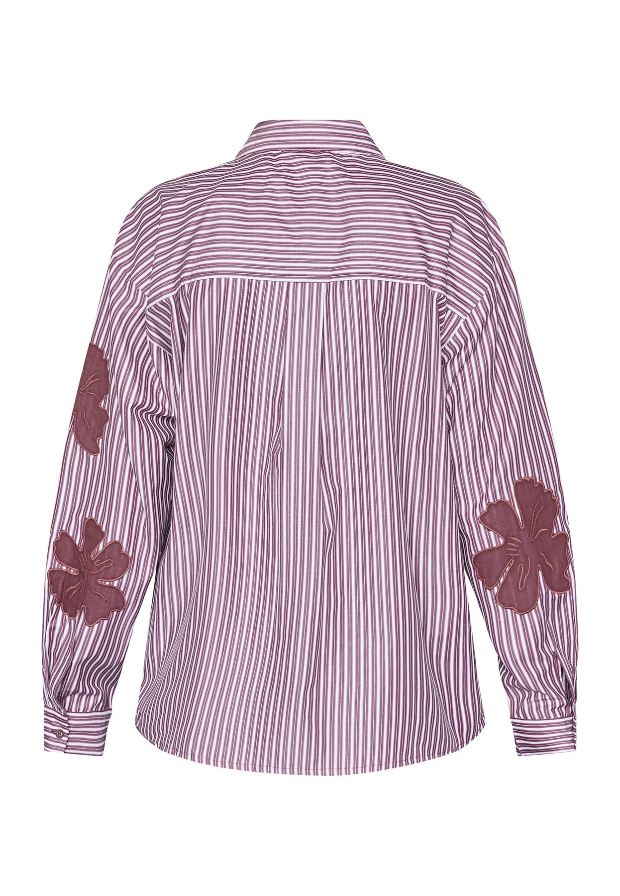 Randig skjorta från Love & Divine med stora blomsterapplikationer i bordeaux. Skjortan har klassisk krage och knapplåsning.