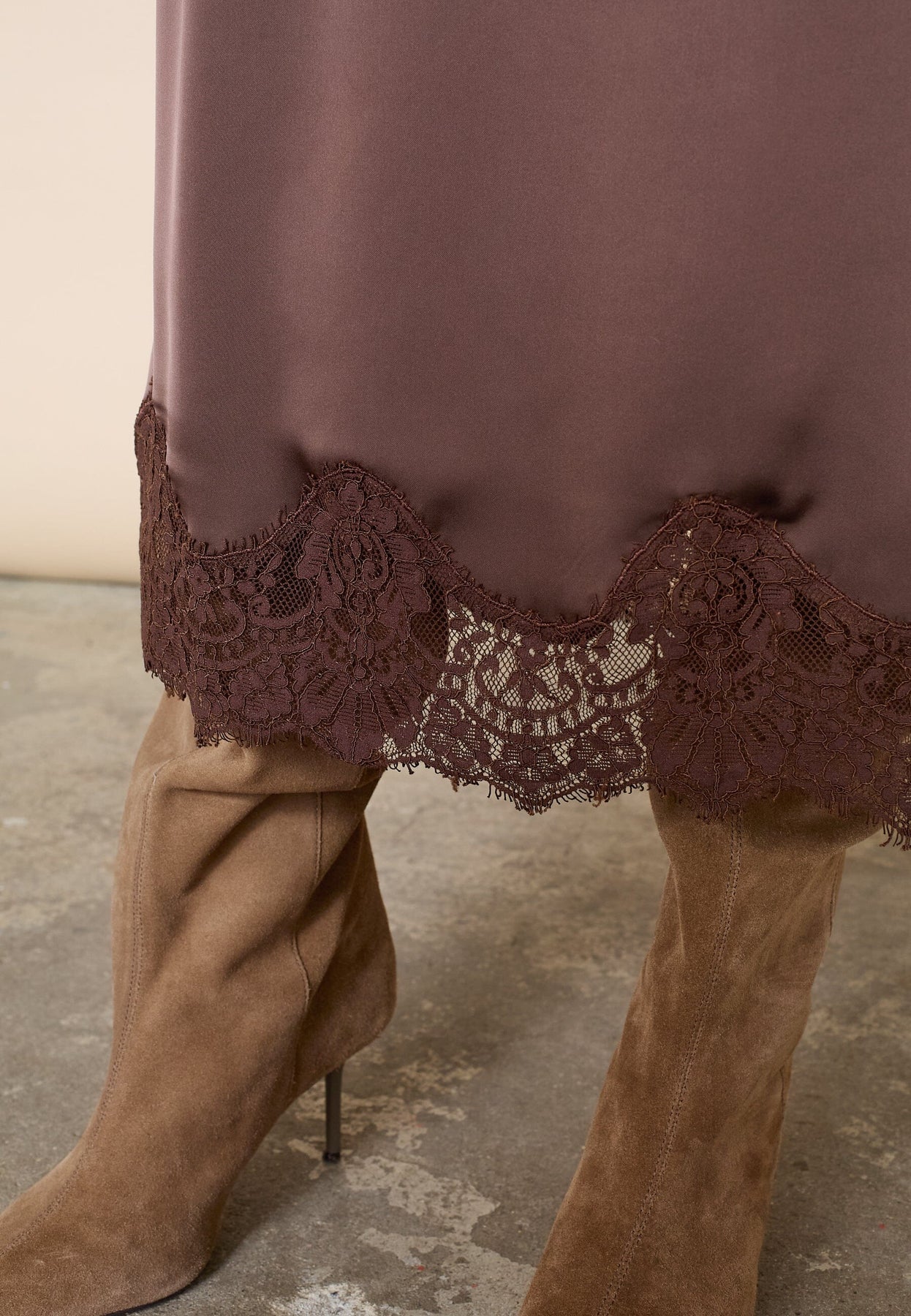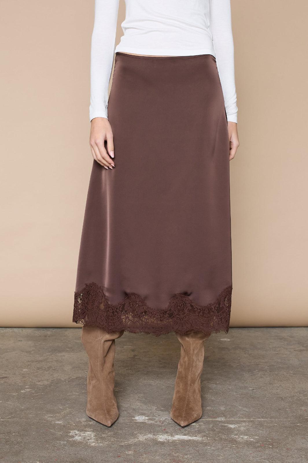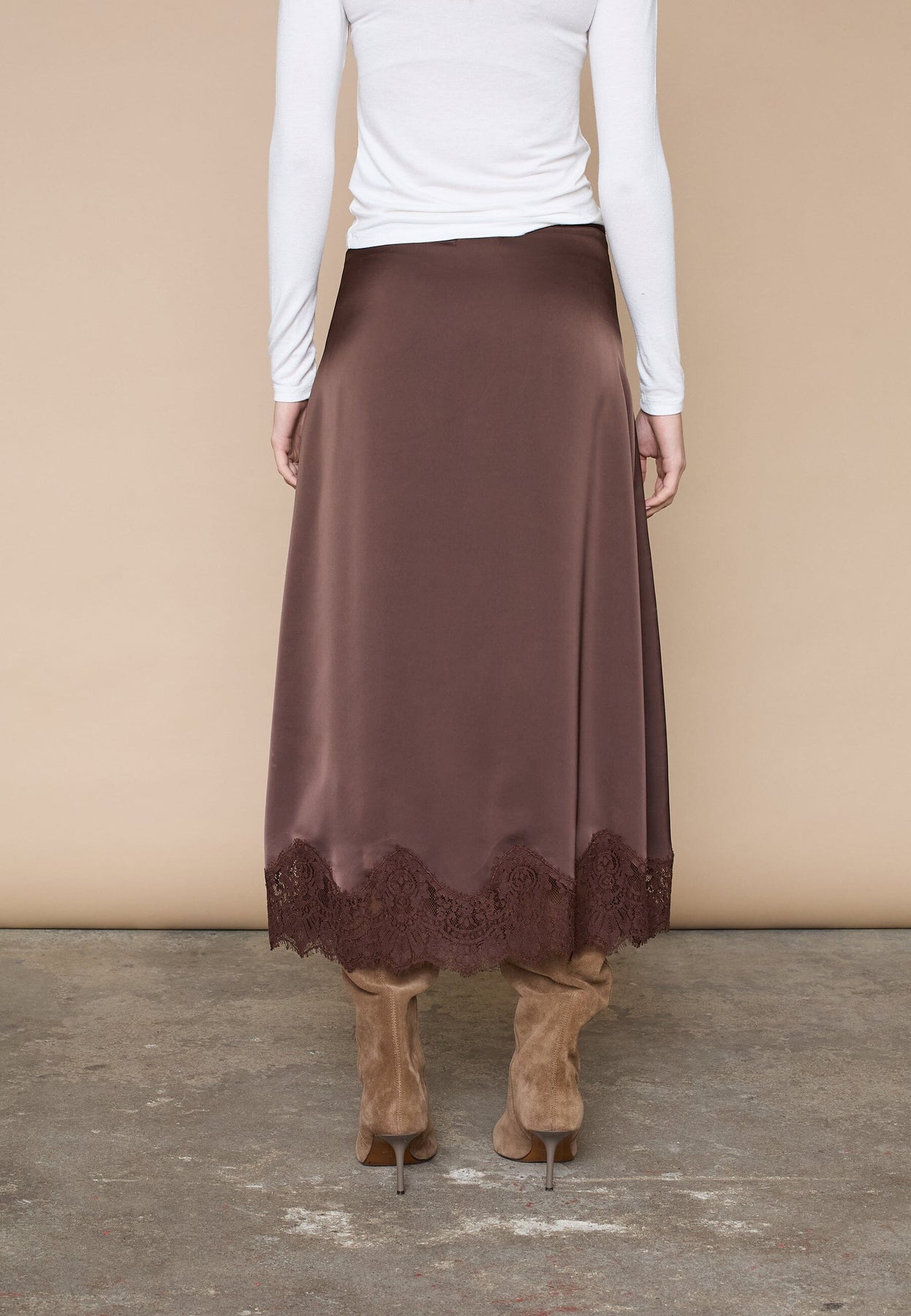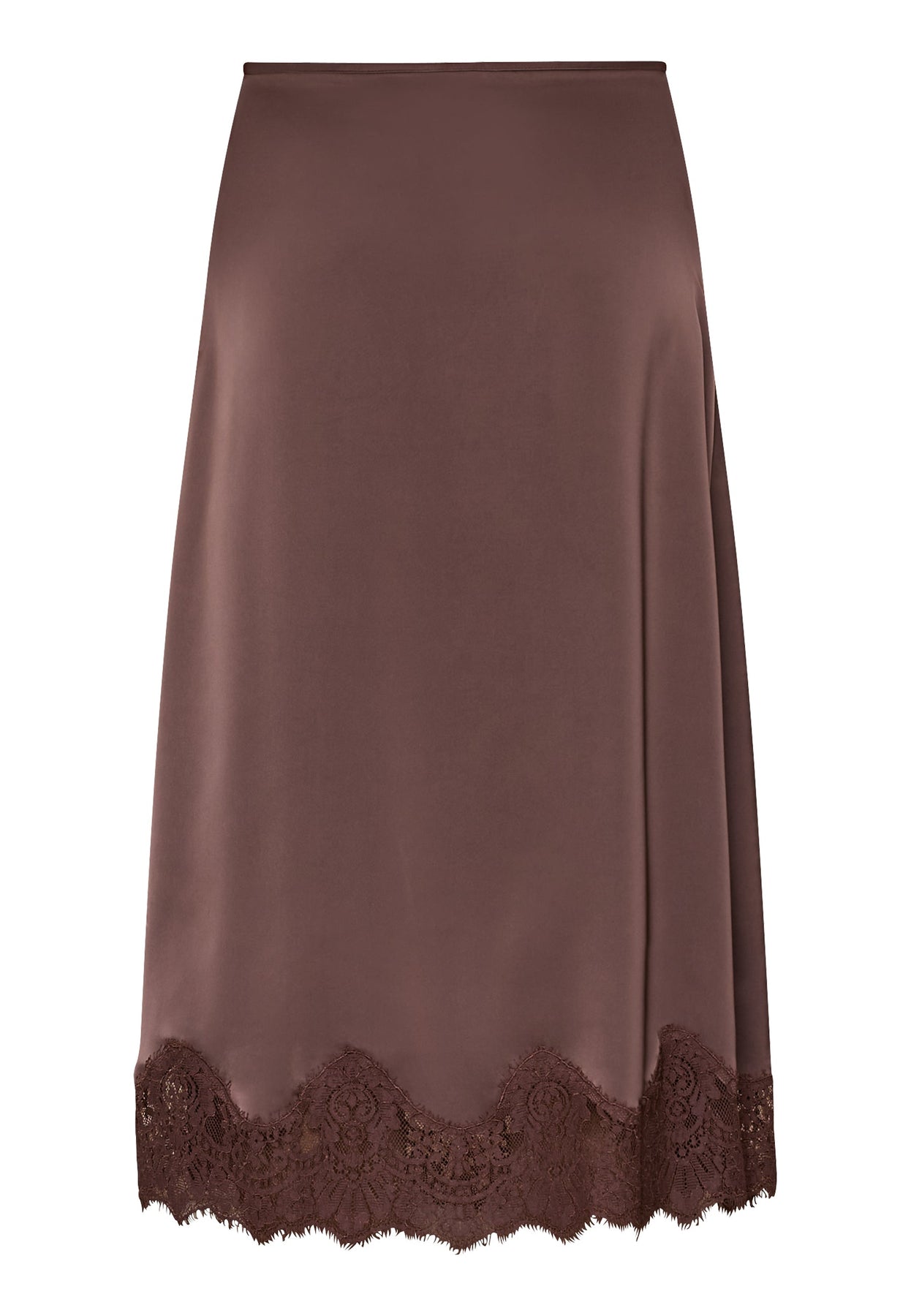 Brun kjol från Love & Divine med spetskant. Kjolen har en slät yta och en A-linjeformad skärning som ger en lätt form.