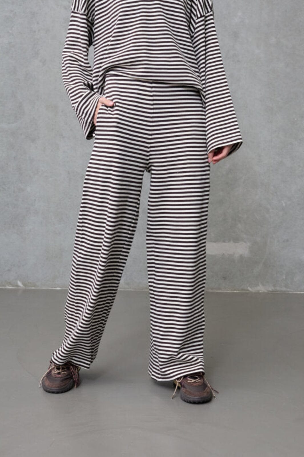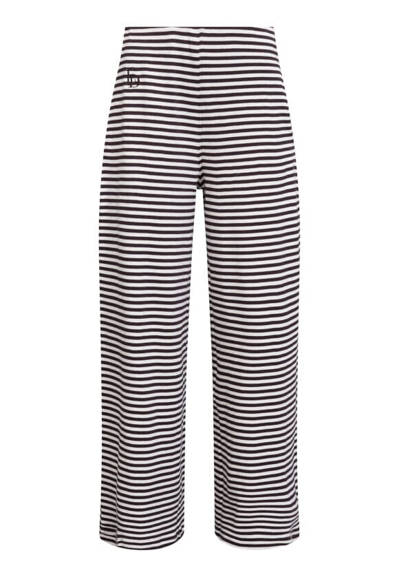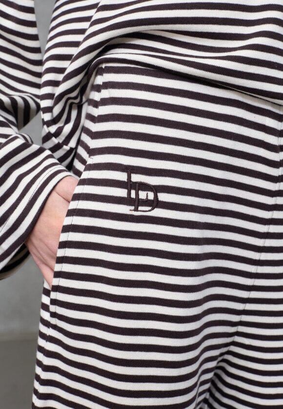 Randiga byxor från Love & Divine i creme och brunt. Byxorna är tillverkade av 100 % bomull och har en lös passform med golvlång längd.