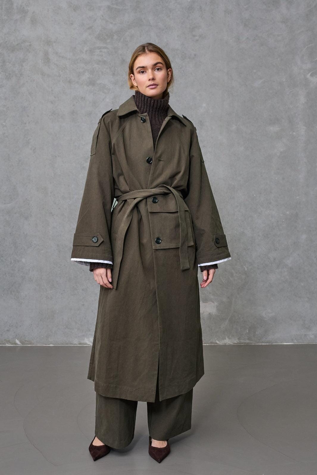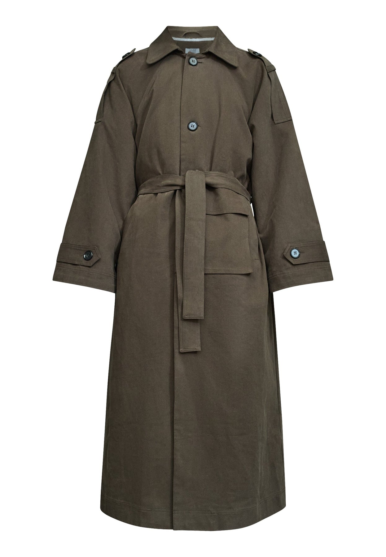 Brun kappa från Love & Divine, tillverkad av 100 % bomull. Kappan har en lång längd med knappar framtill och knytskärp i midjan.