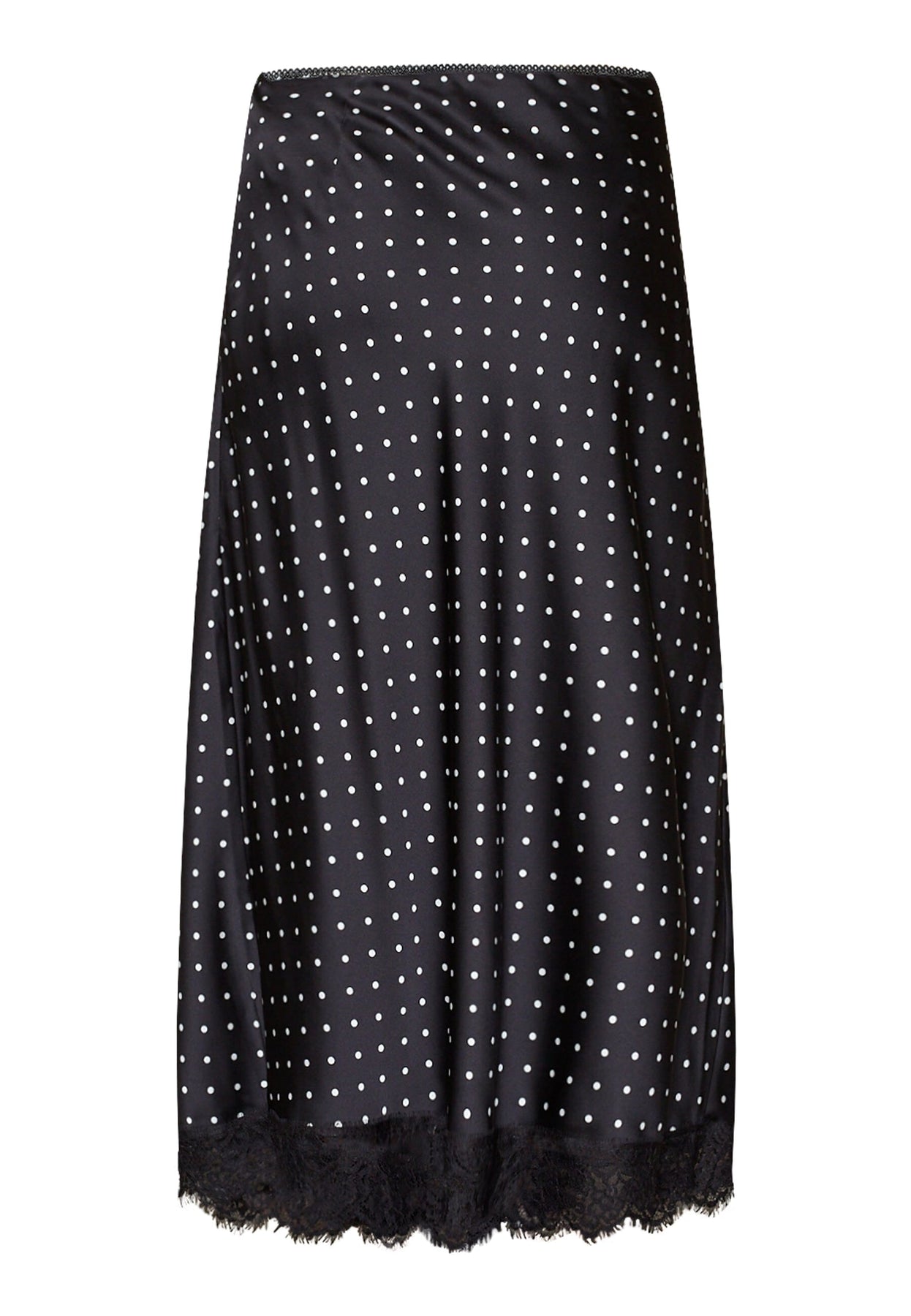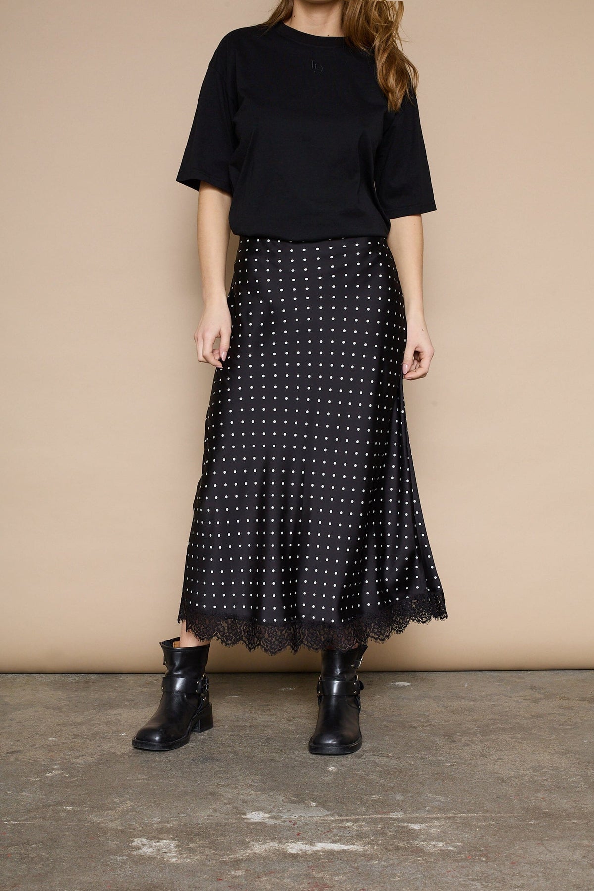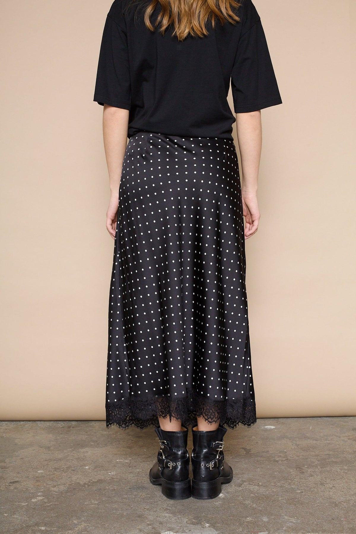 Svart kjol från Love & Divine med vita prickar. Kjolen har en spetskant nedtill och går till mitten av vaden.