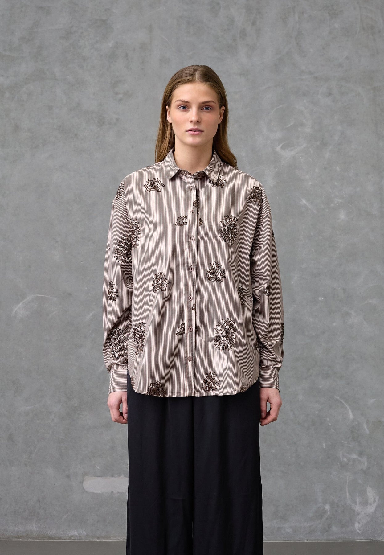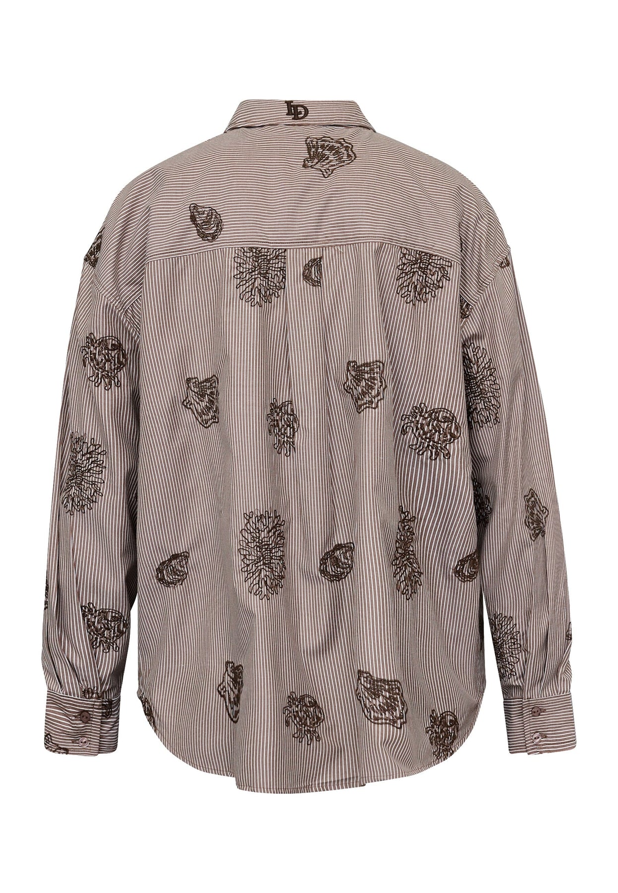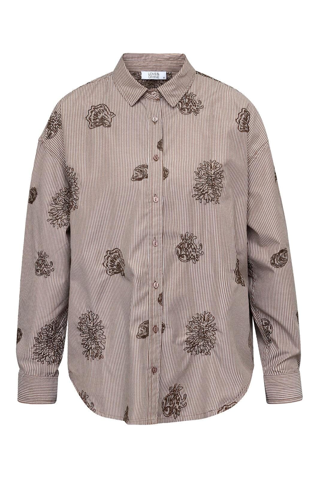 Brunrandig skjorta från Love & Divine, tillverkad av 100 % bomull. Skjortan har paisleymönster med broderi på de bruna ränderna.