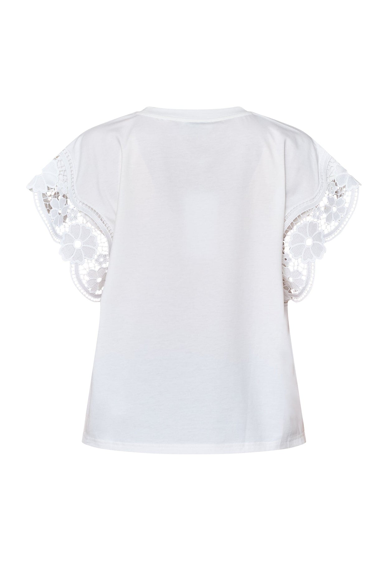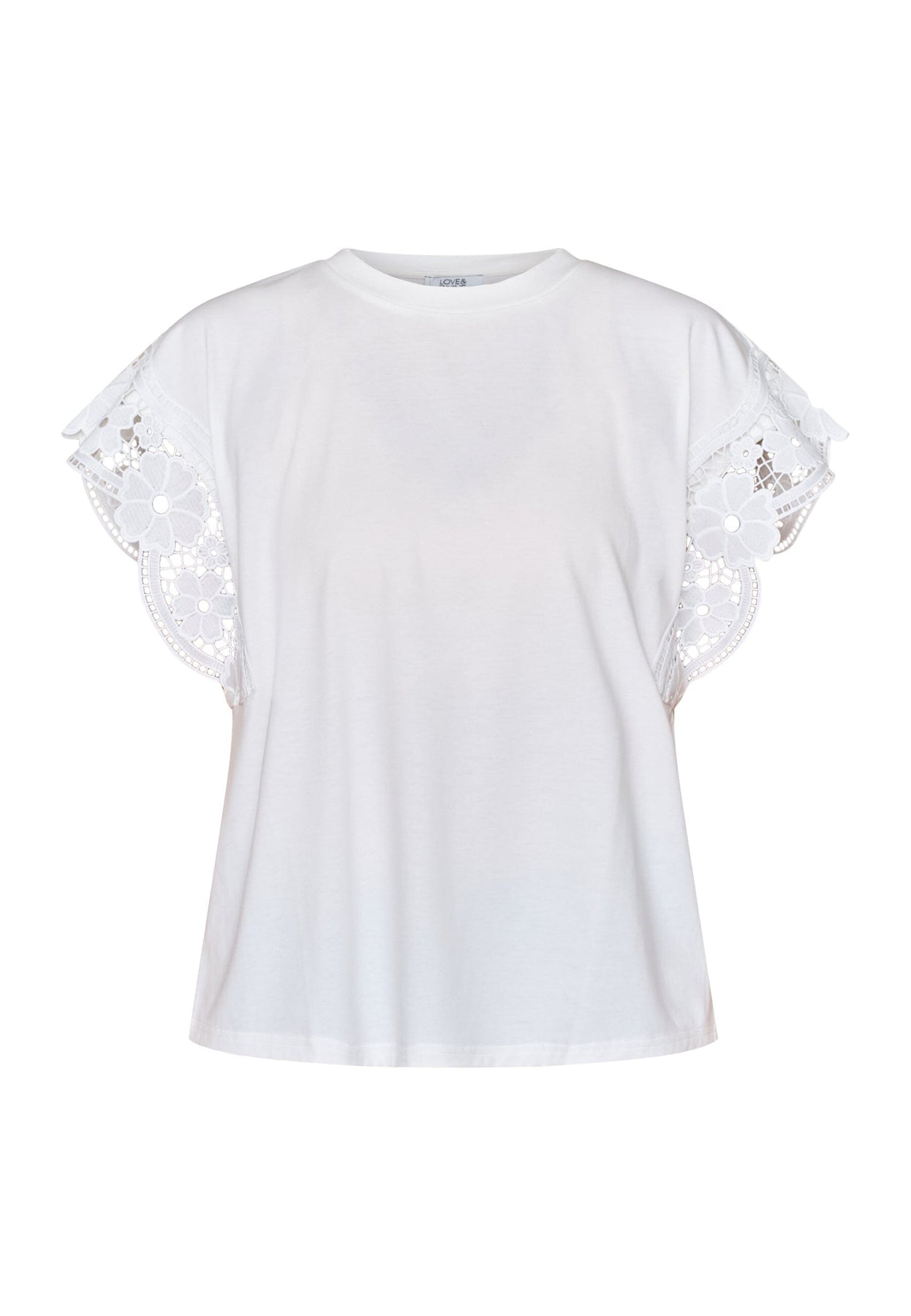 Vit T-shirt från Love & Divine med spets på ärmarna. Spetsen har blomdetaljer i broderie anglaise-stil och ger T-shirten ett feminint uttryck.