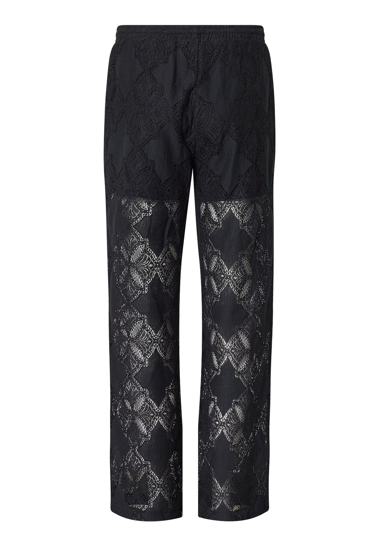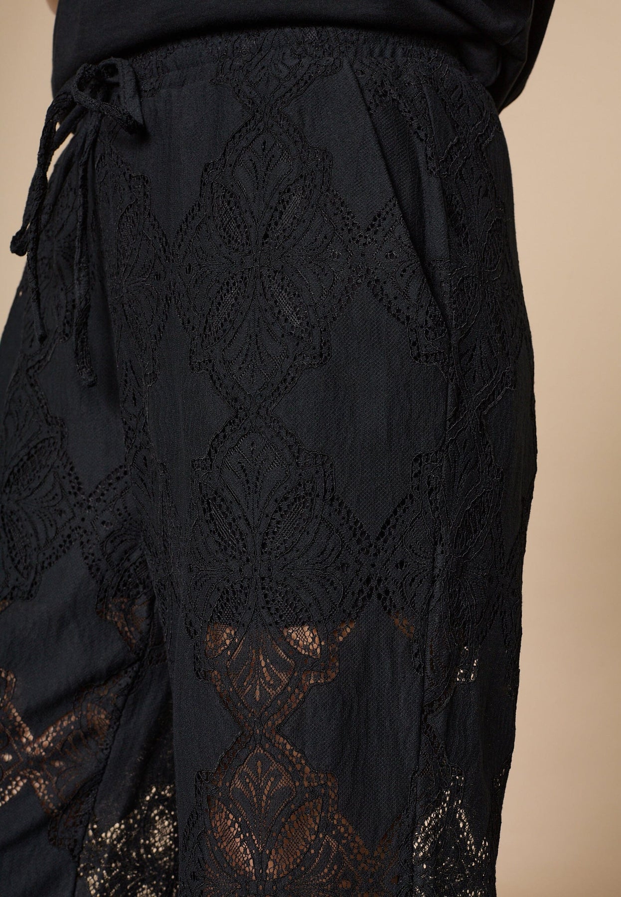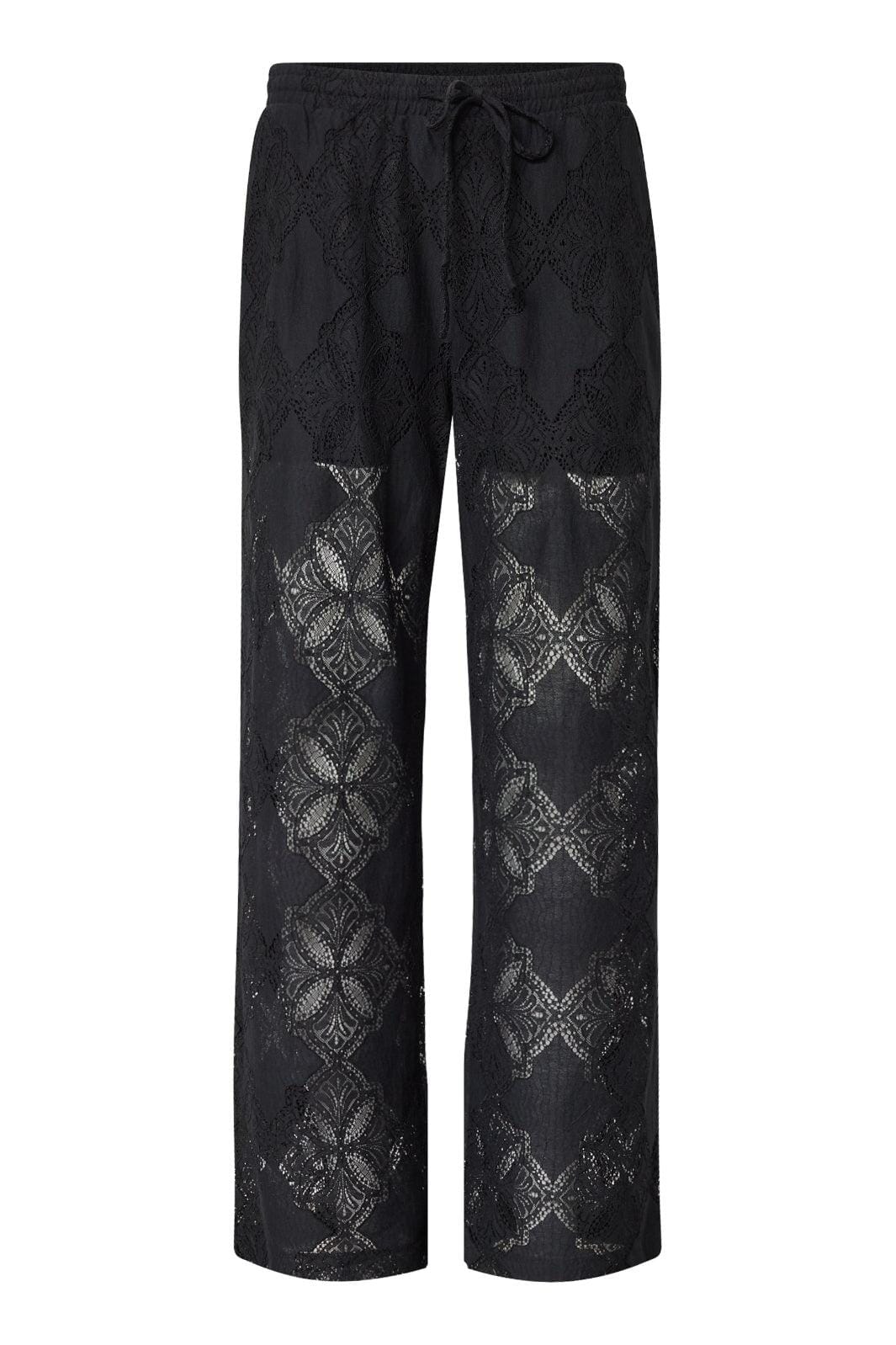 Svarta byxor från Love & Divine med genombrutet spetsmönster. Byxorna har normal midjehöjd och går till ankeln.