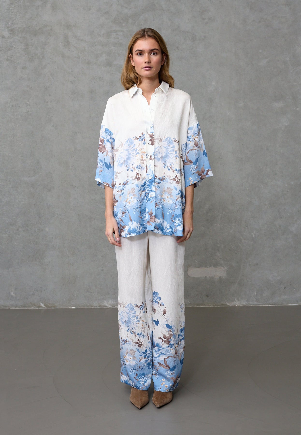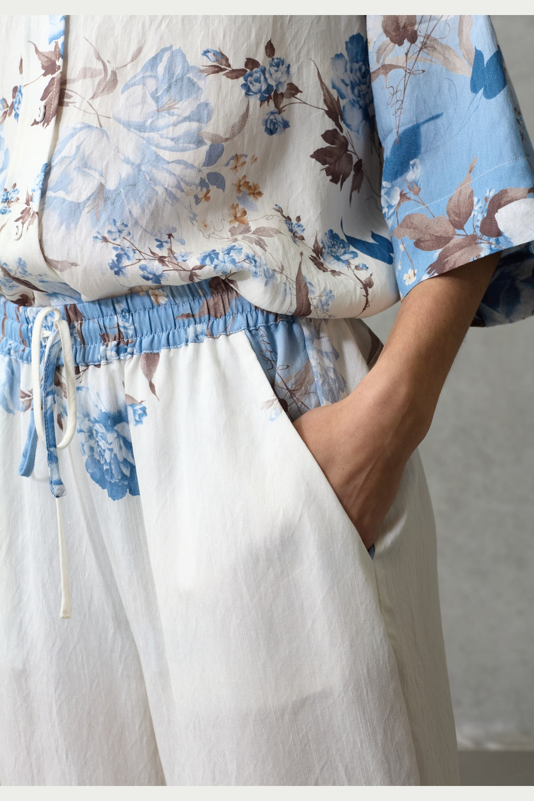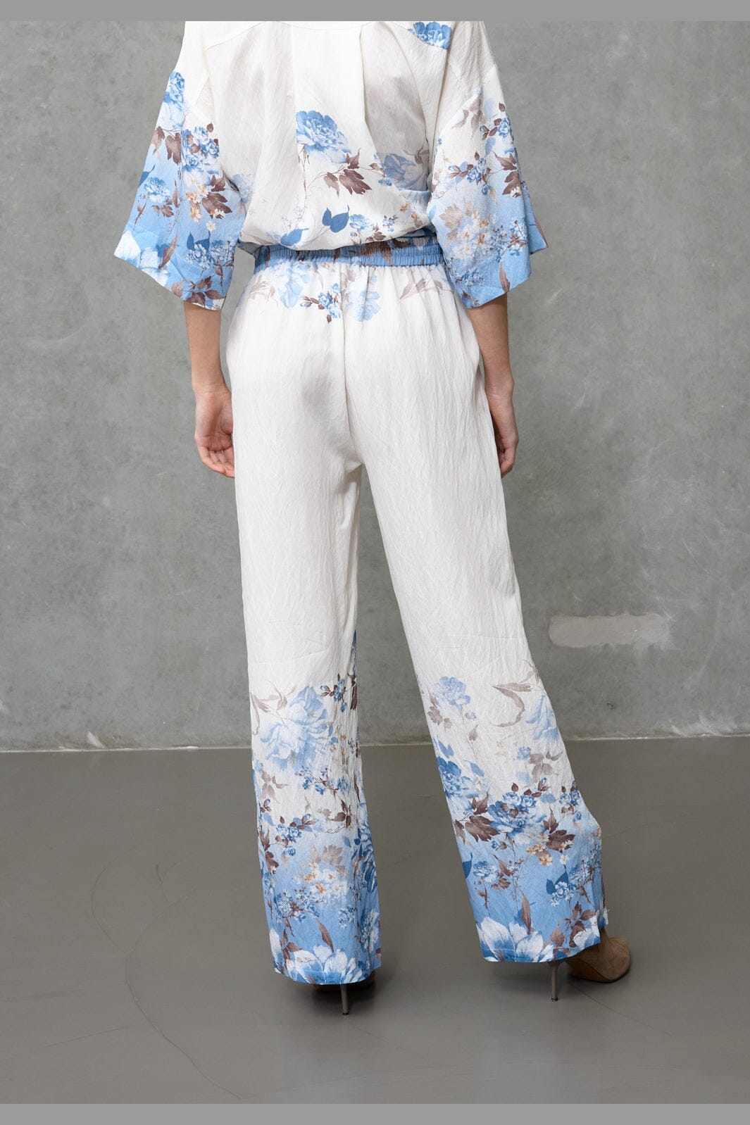 Byxor från Love & Divine med blommigt tryck i blå och bruna nyanser. Byxorna har en lös passform och går till ankeln.