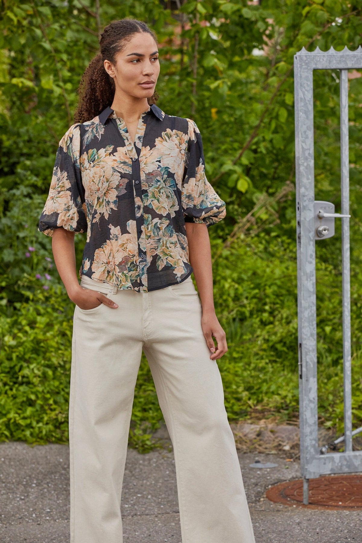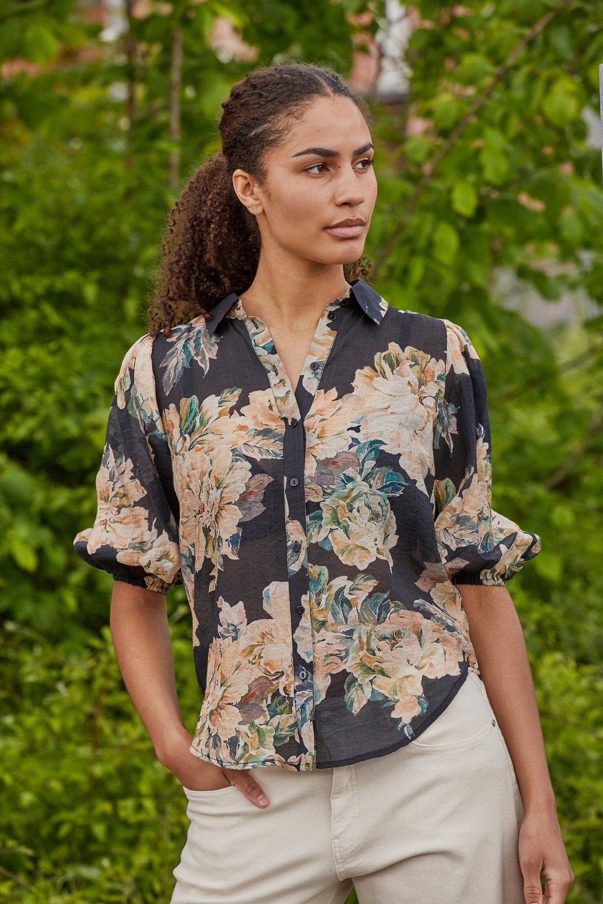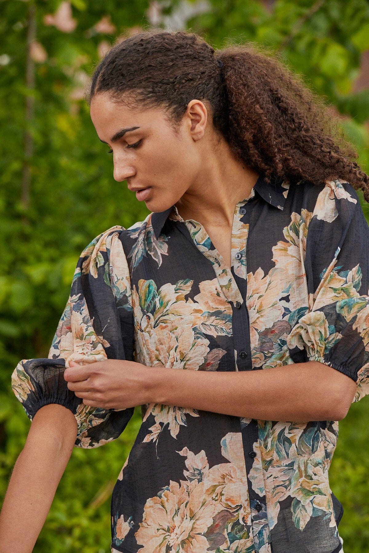 Svart skjorta med stora blommor i persiko- och gröna nyanser. Det lätta, transparenta tyget har ett mjukt fall, och de puffiga ärmarna ger skjortan ett karaktäristiskt uttryck.