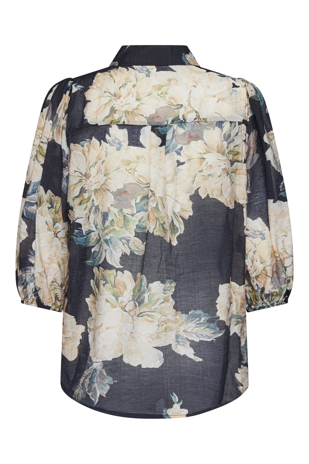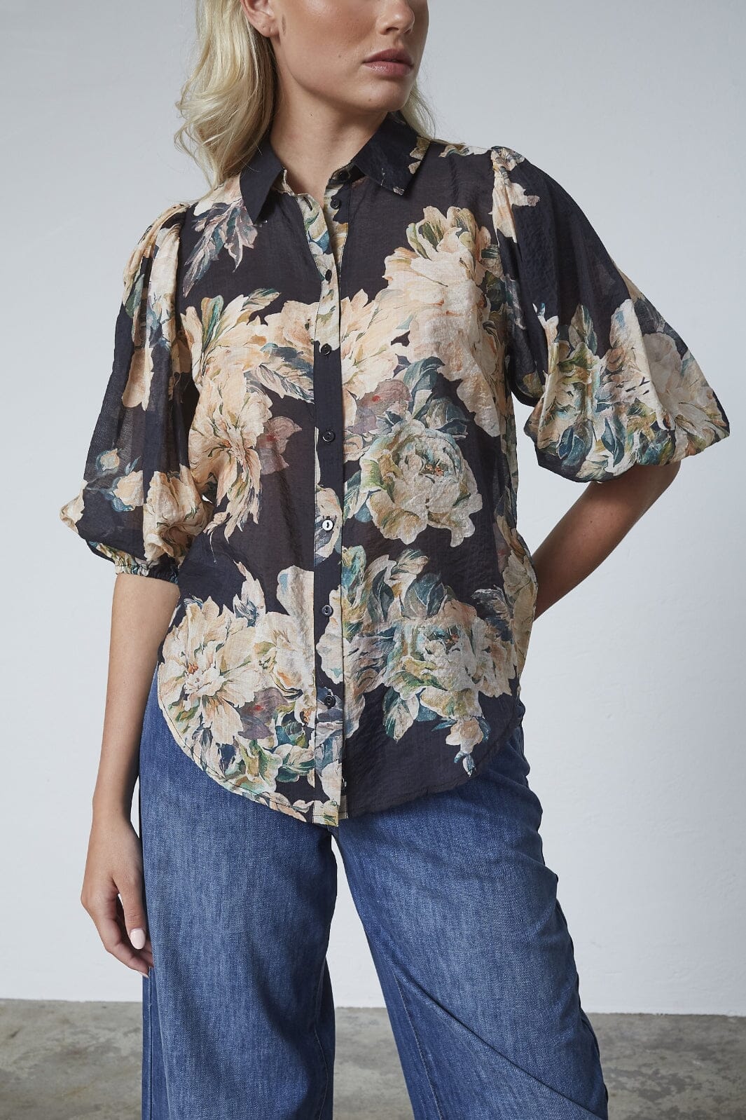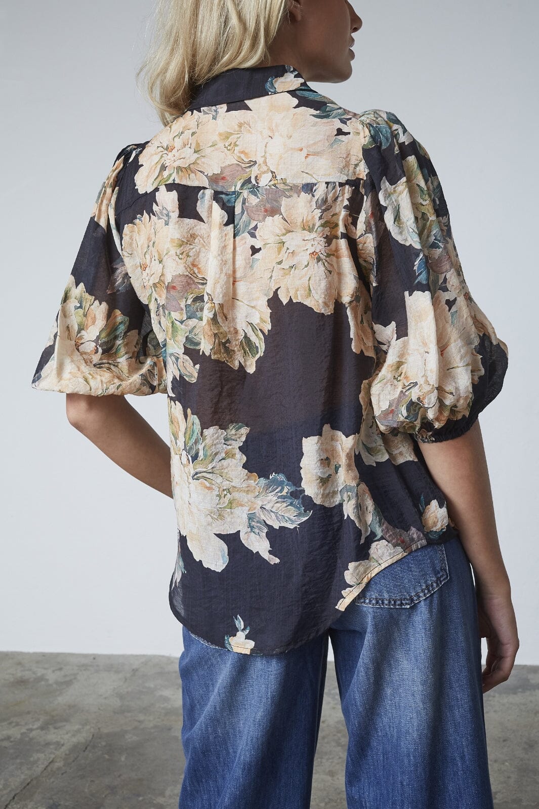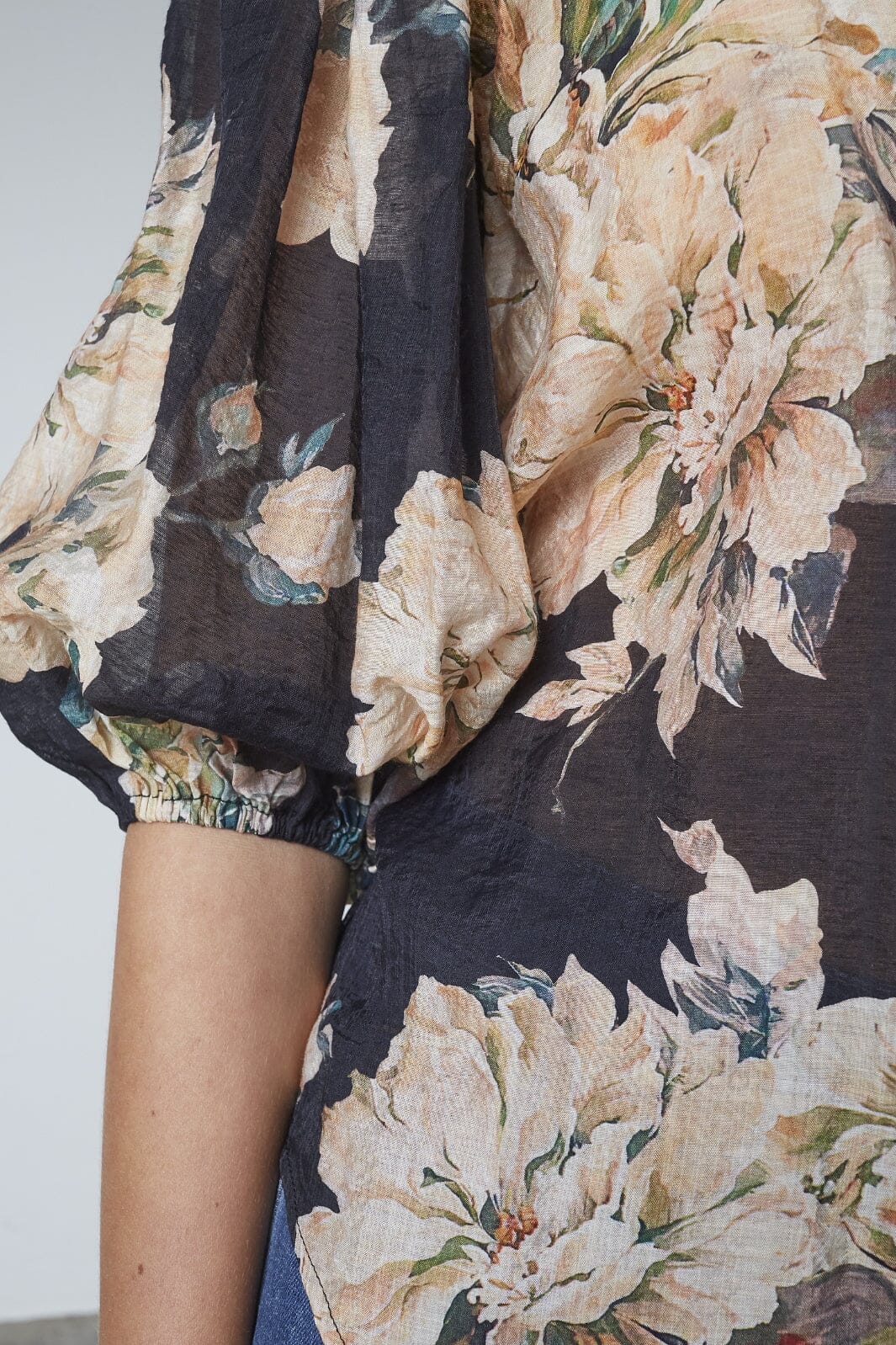 Svart skjorta med stora blommor i persiko- och gröna nyanser. Det lätta, transparenta tyget har ett mjukt fall, och de puffiga ärmarna ger skjortan ett karaktäristiskt uttryck.