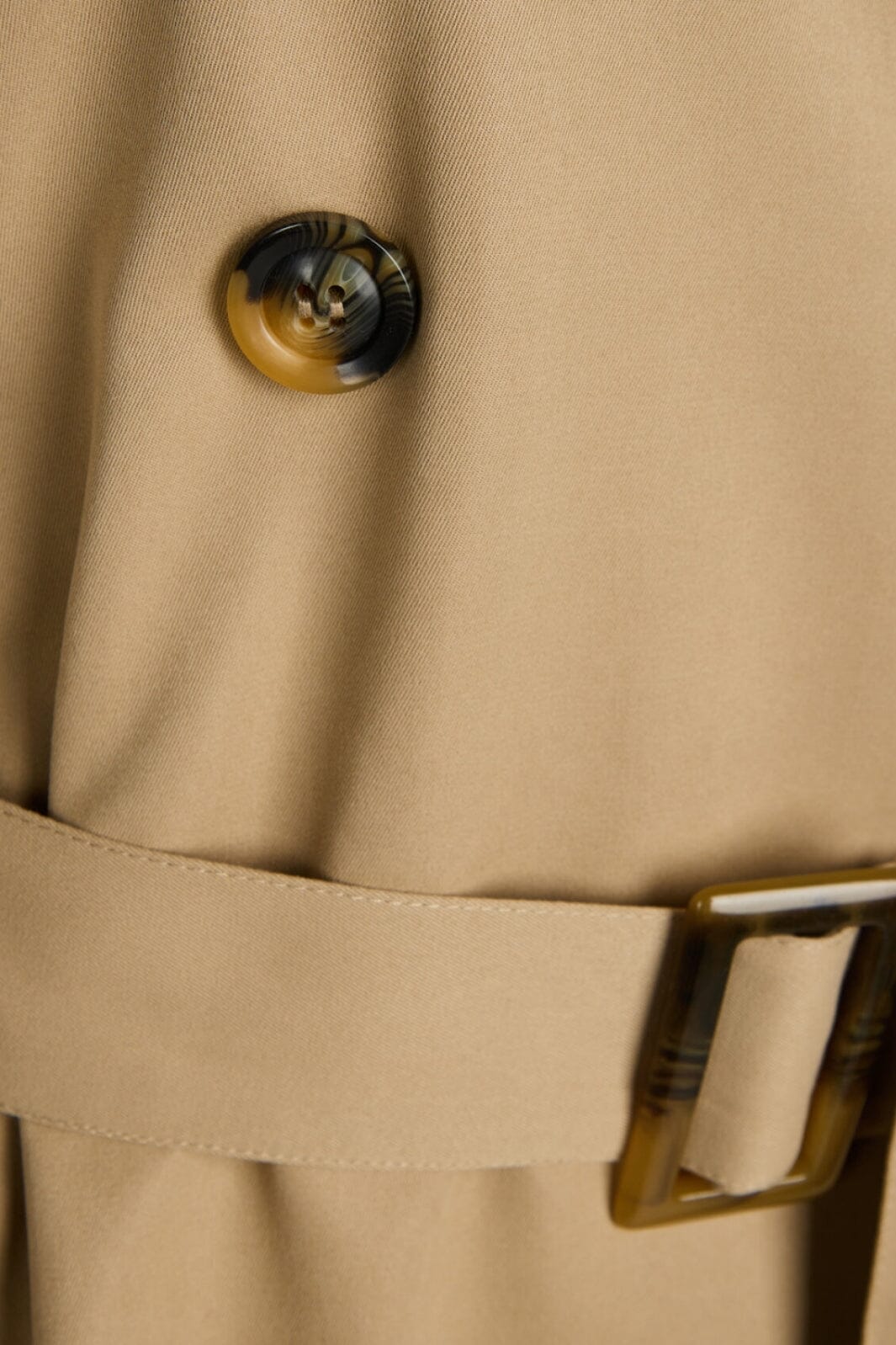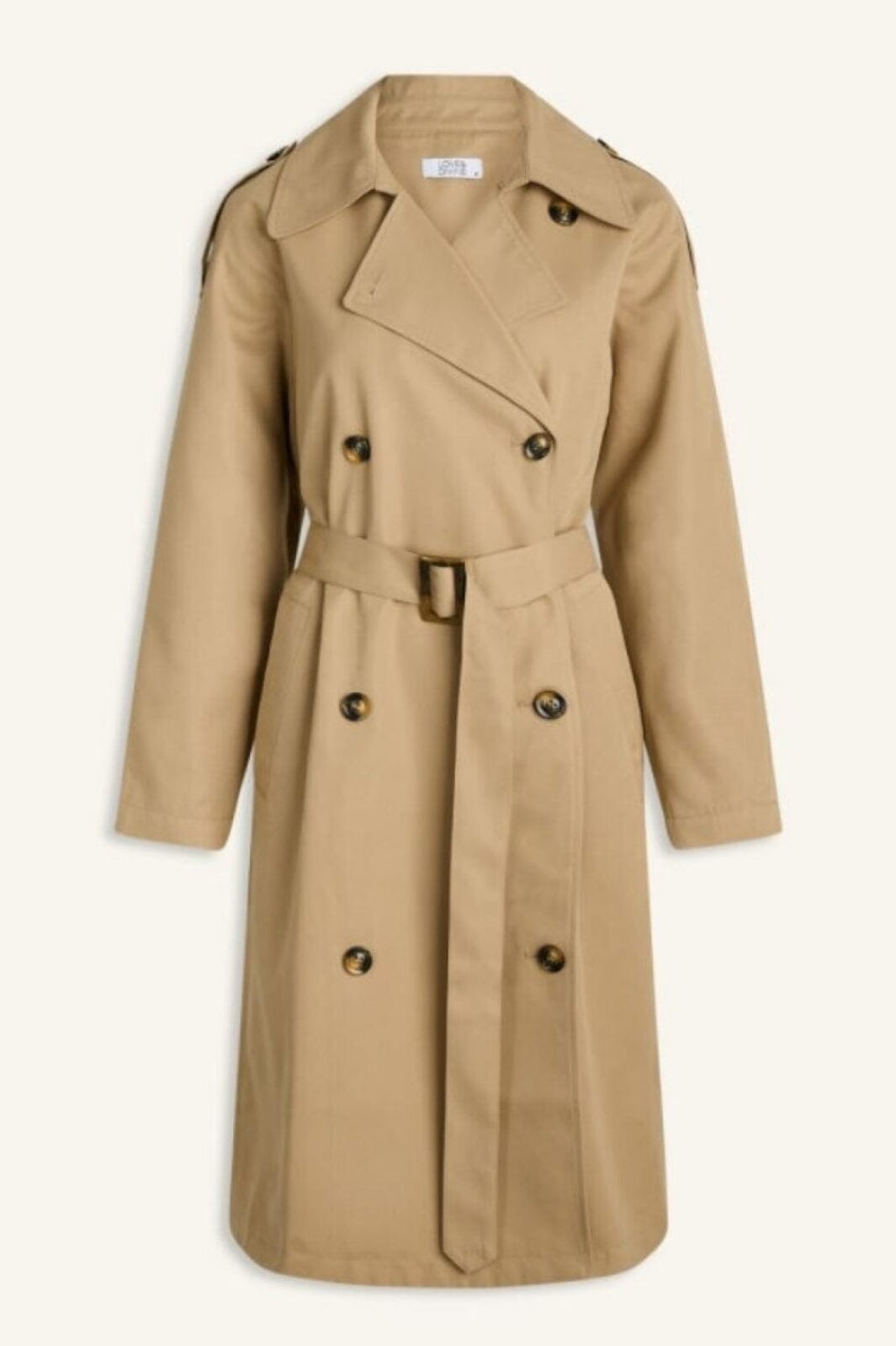 Knelång trenchcoat från Love & Divine i sandfärg. En klassisk jacka med dubbelknäppt front, stora kontrastknappar och skjortkrage.