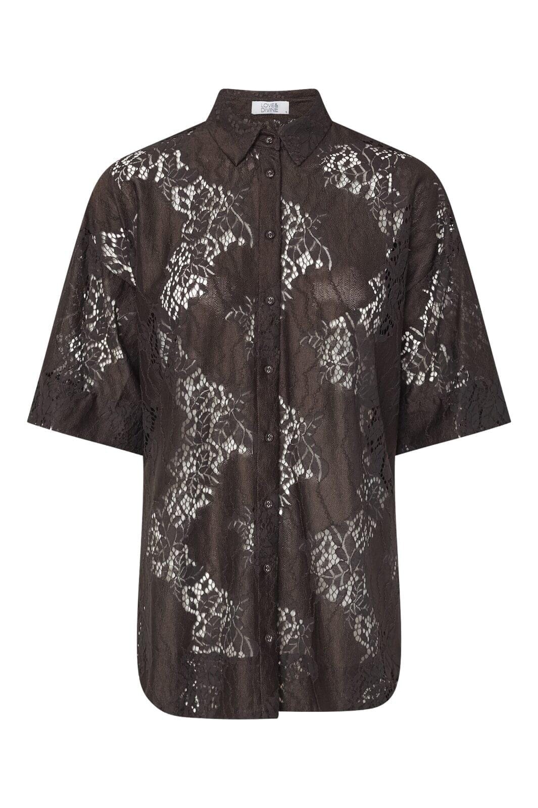 Mörkbrun skjorta från Love & Divine med spets. Skjortan har en lös passform, korta ärmar och en klassisk skjortkrage med knapplåsning fram.