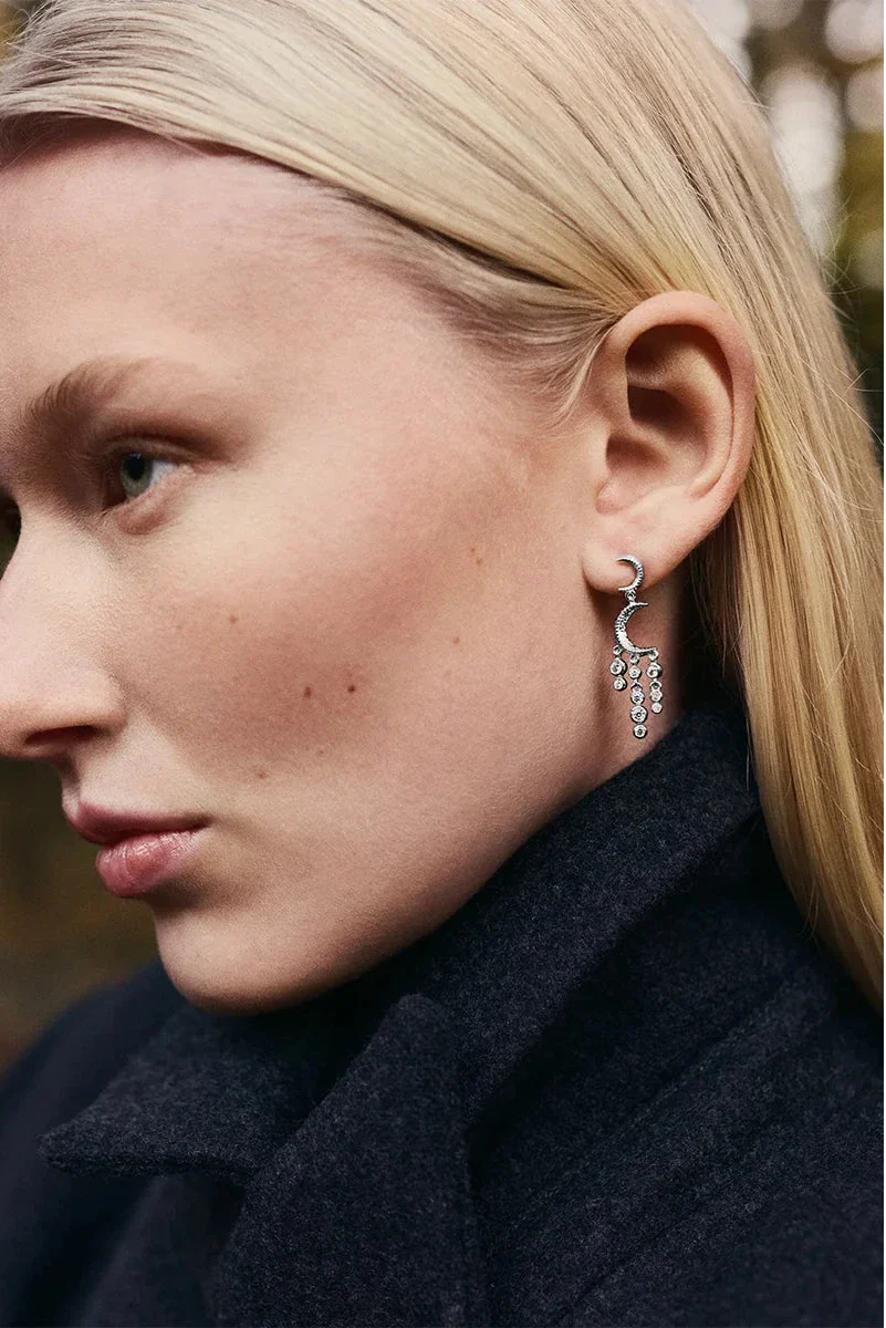 Örhängen från Maanesten med en halvmåneformad design. Varje örhänge har flera hängande element prydda med stenar i silverfärg.
