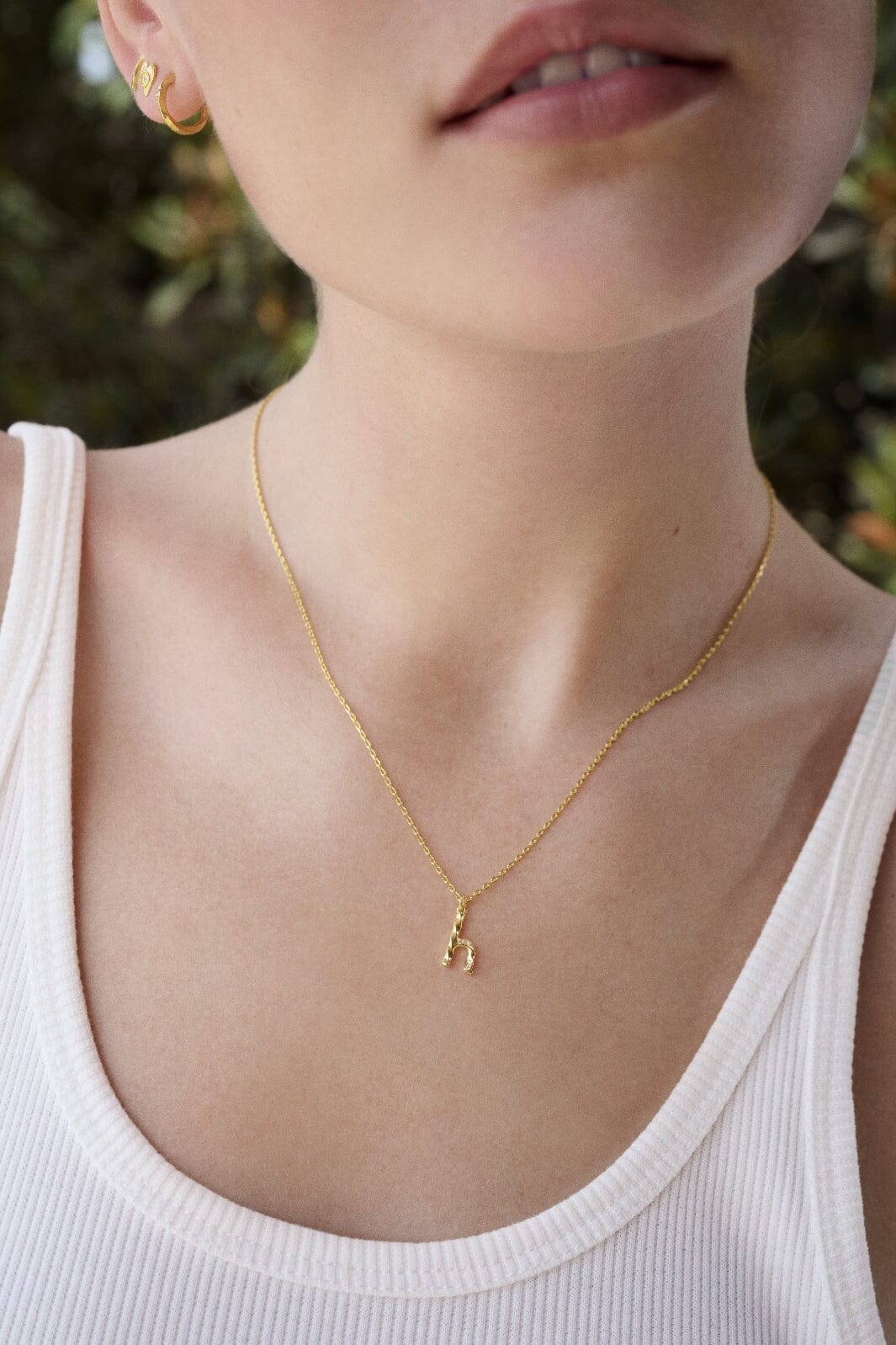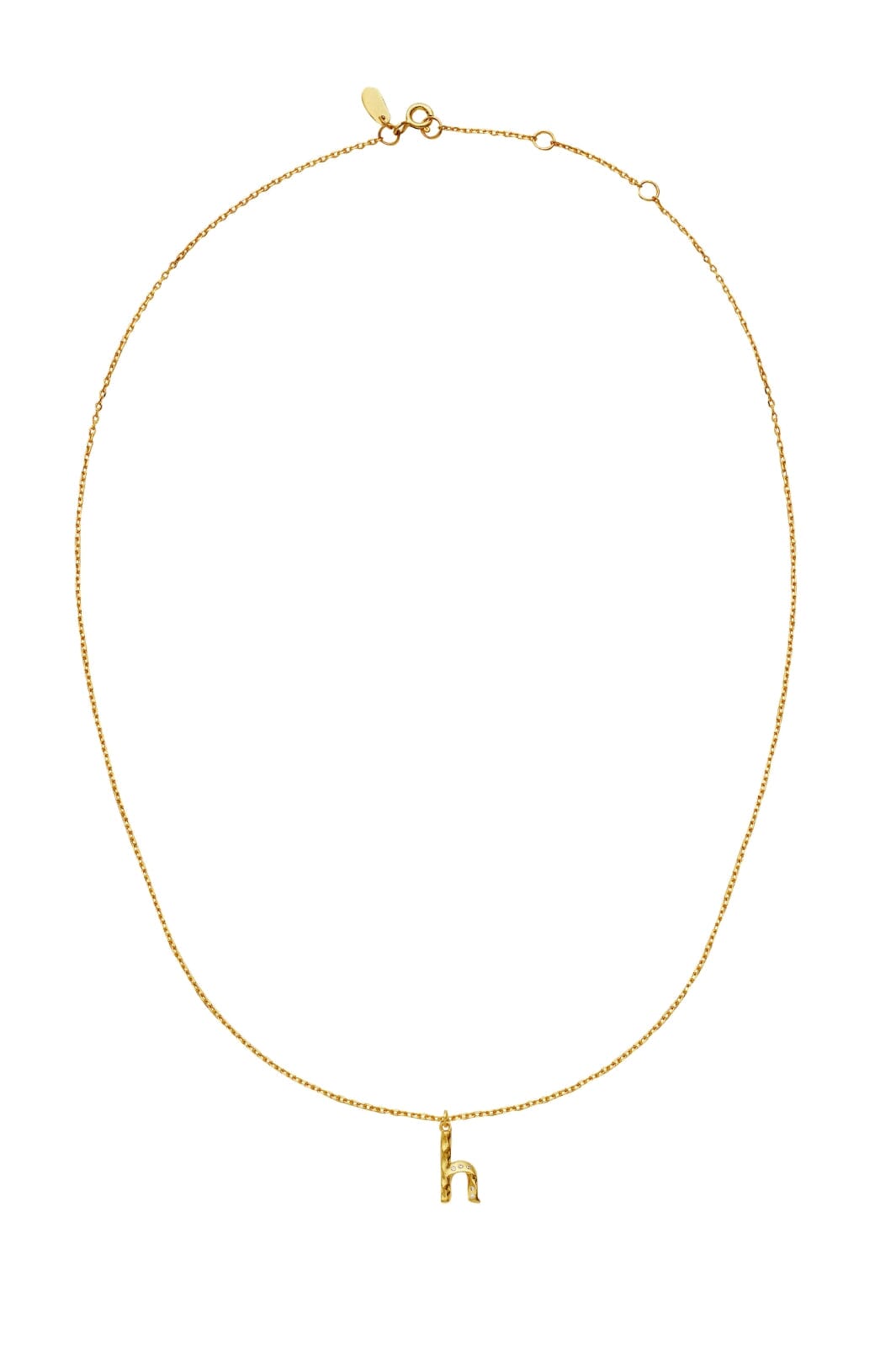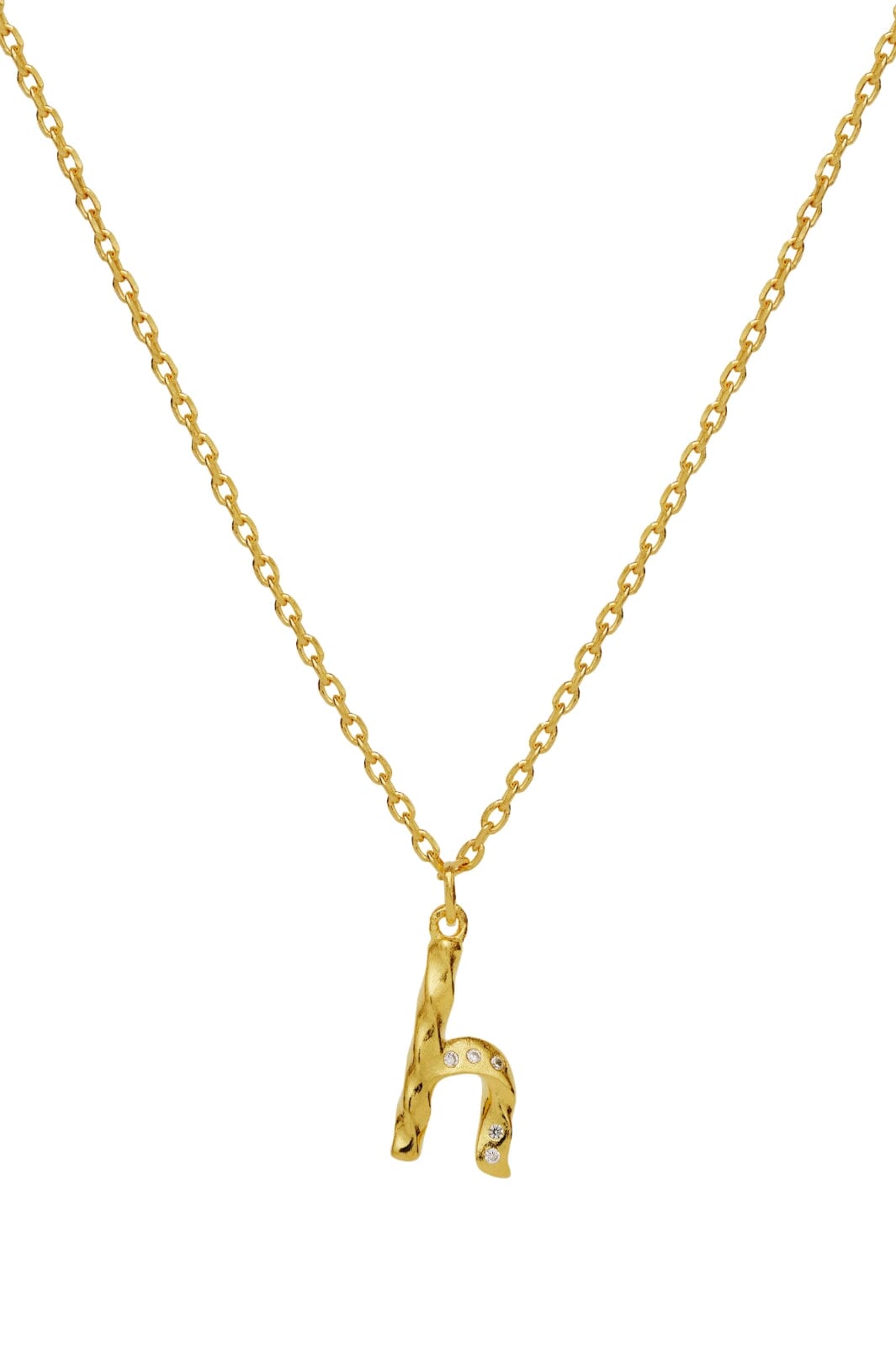Guldpläterat halsband från Maanesten med ett h-format hänge. Hänget har en strukturerad yta med små dekorativa stenar och sitter på ett fint kedja med länkdesign.