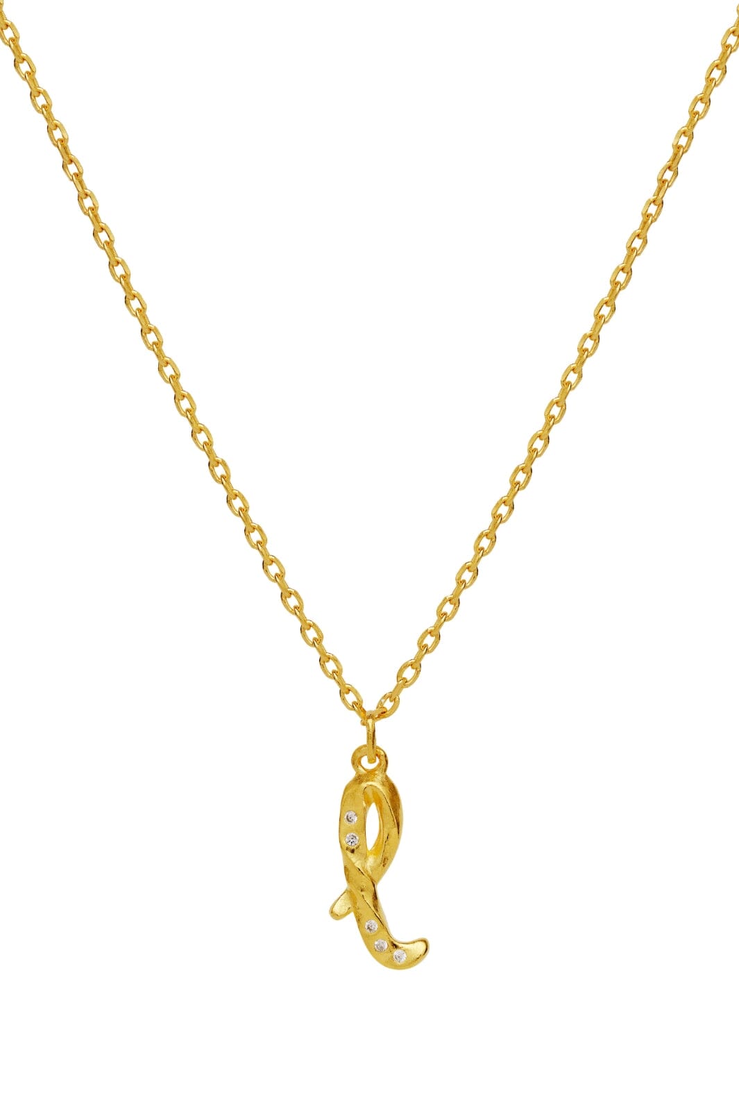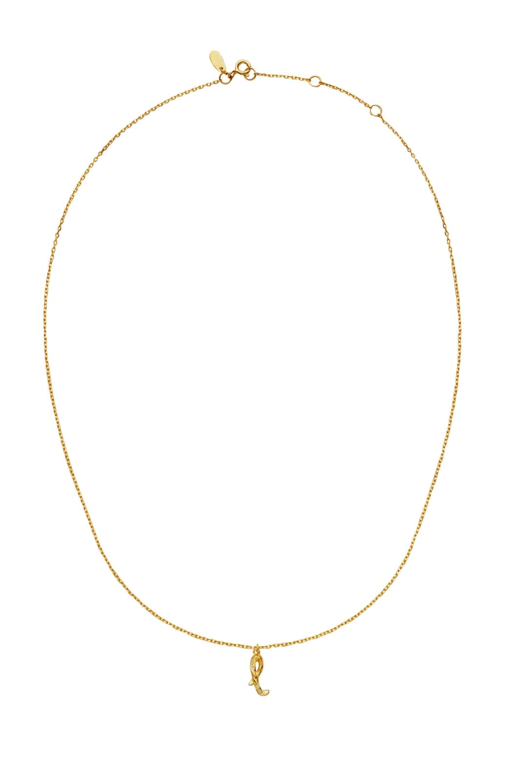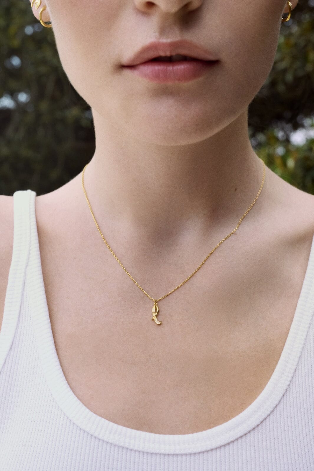 Guldhalsband från Maanesten med ett L-format hänge. Kedjan är tillverkad av återvunnet sterlingsilver med 18 karat guldplätering, vilket ger smycket en varm gyllene färg.