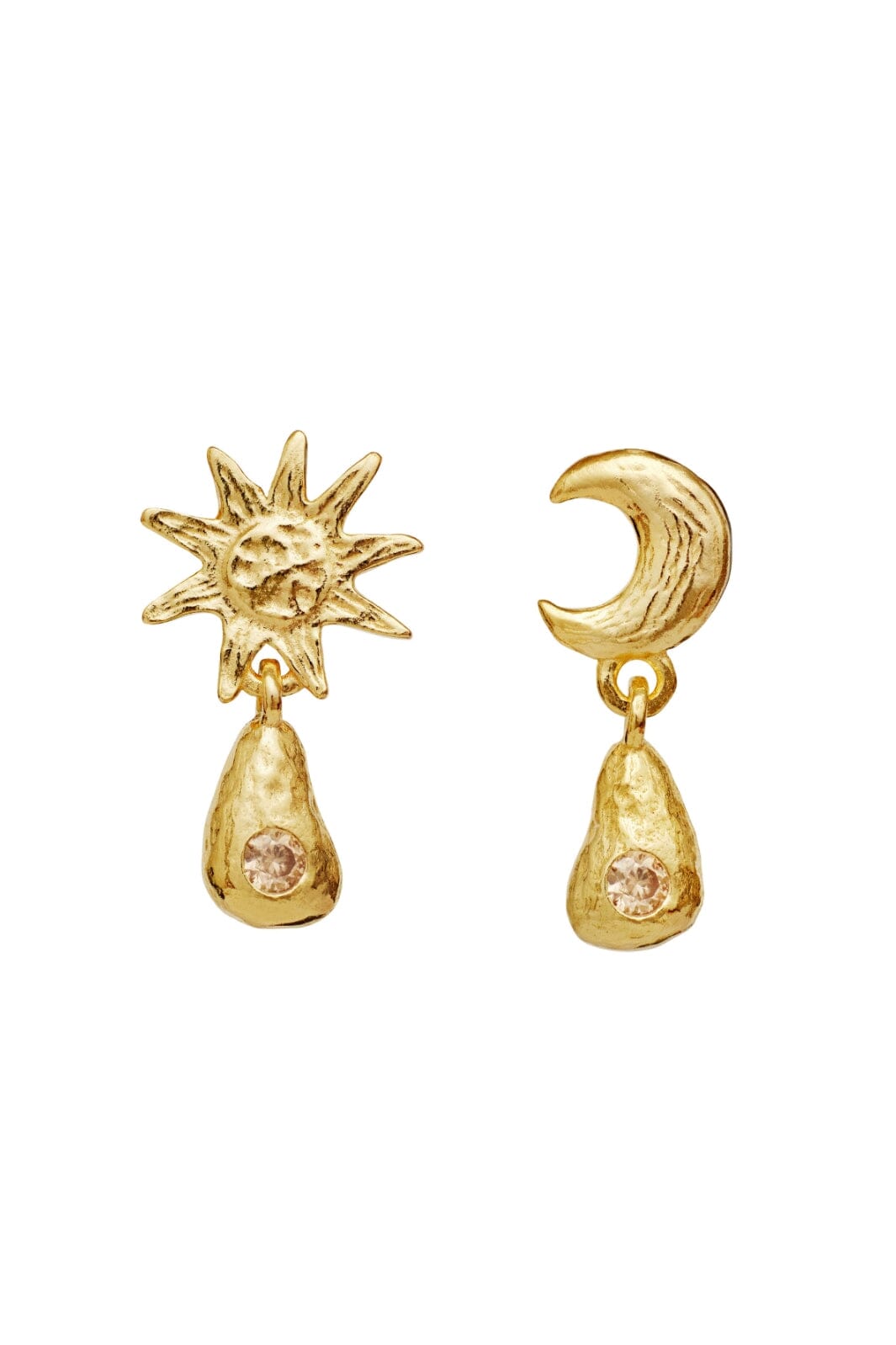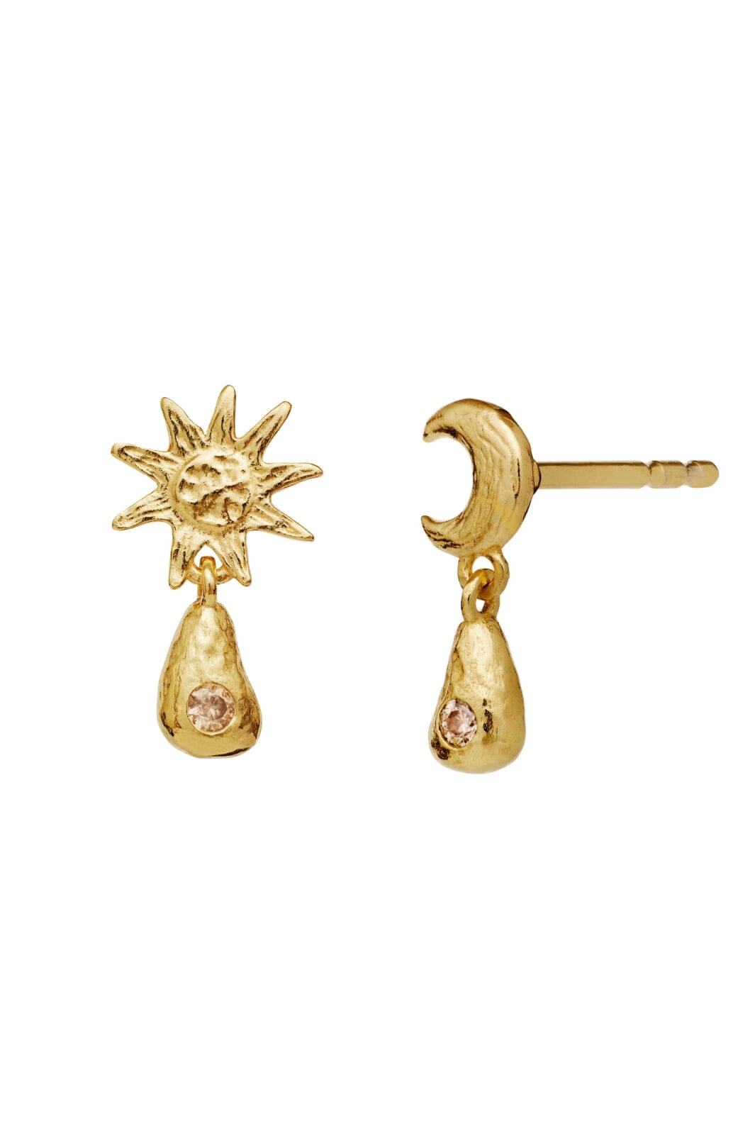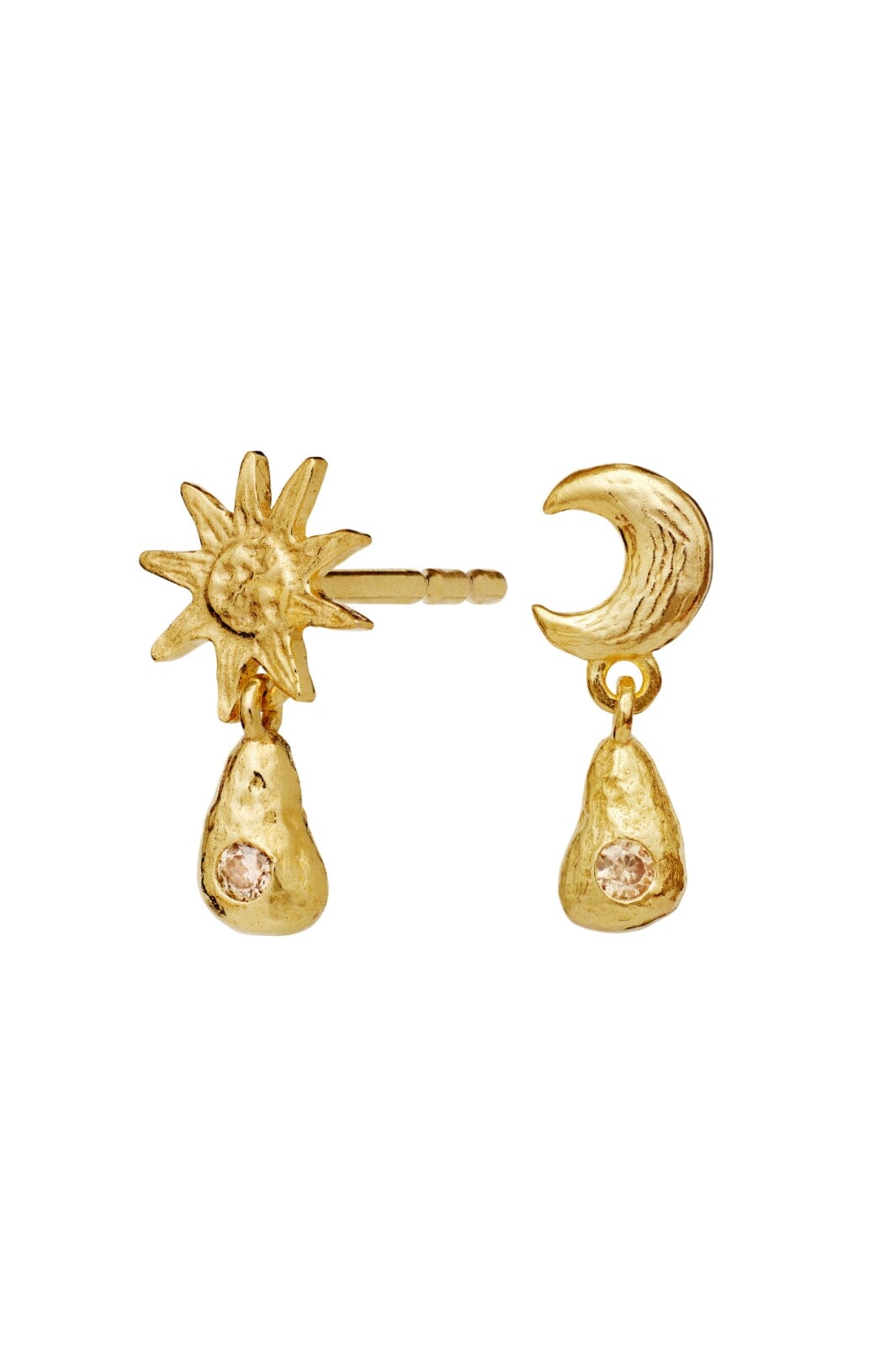 Guldörhängen från Maanesten med sol- och månmotiv. De droppformade hängena har var och en en liten ädelsten och är tillverkade av återvunnet sterling silver med guldplätering.