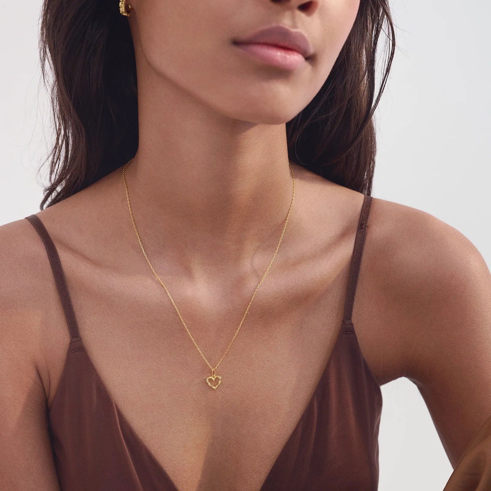 Et hänge från Maanesten med en hjärtformad design. Det är gjort av återvunnet sterlingsilver pläterat med 18 karat guld i en gyllene färg.