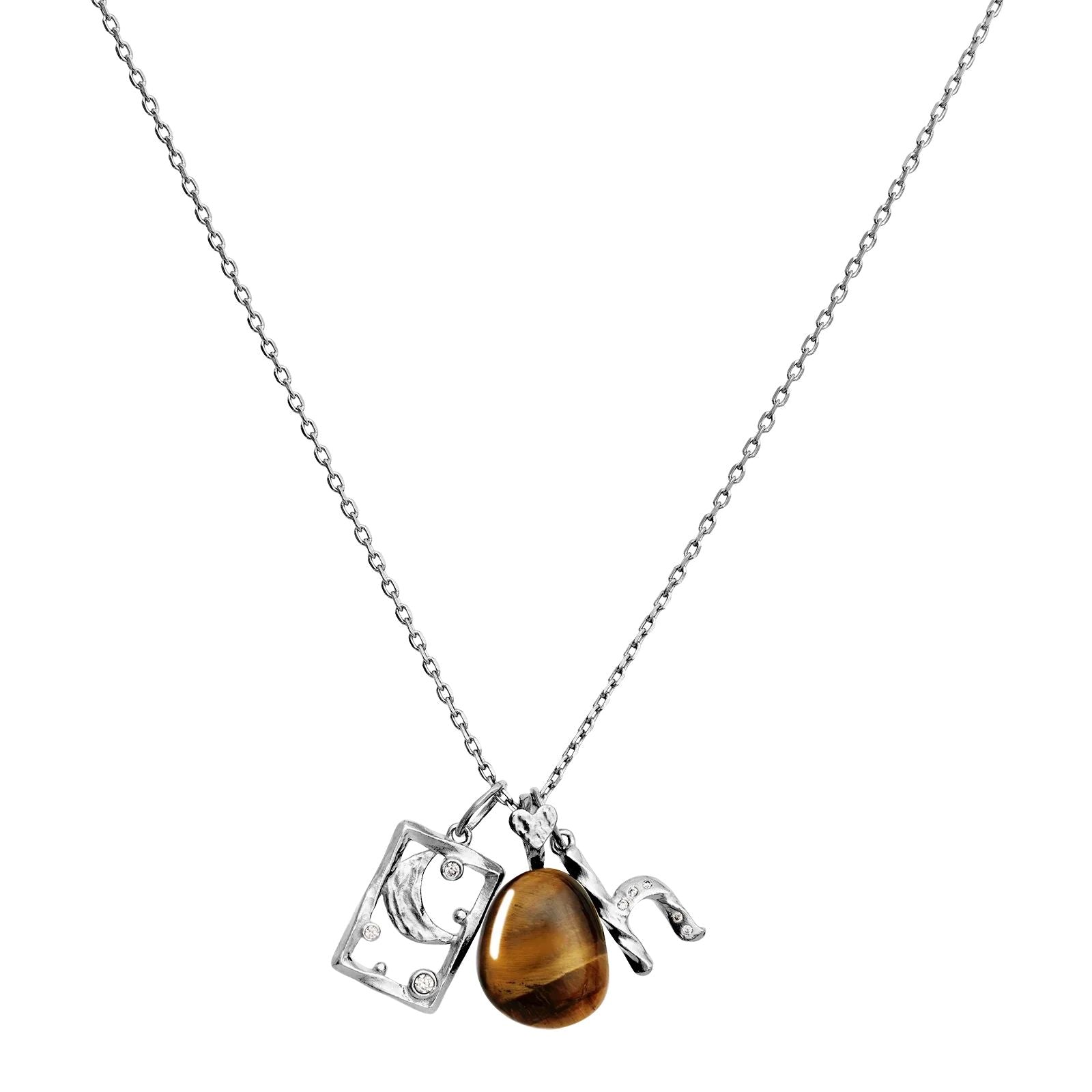 Hänge från Maanesten med en dropformad tigeröga-sten i guld- och bruna nyanser. Stenen har ett randigt mönster och en slät yta. Hänget har ett hjärtformat fäste.