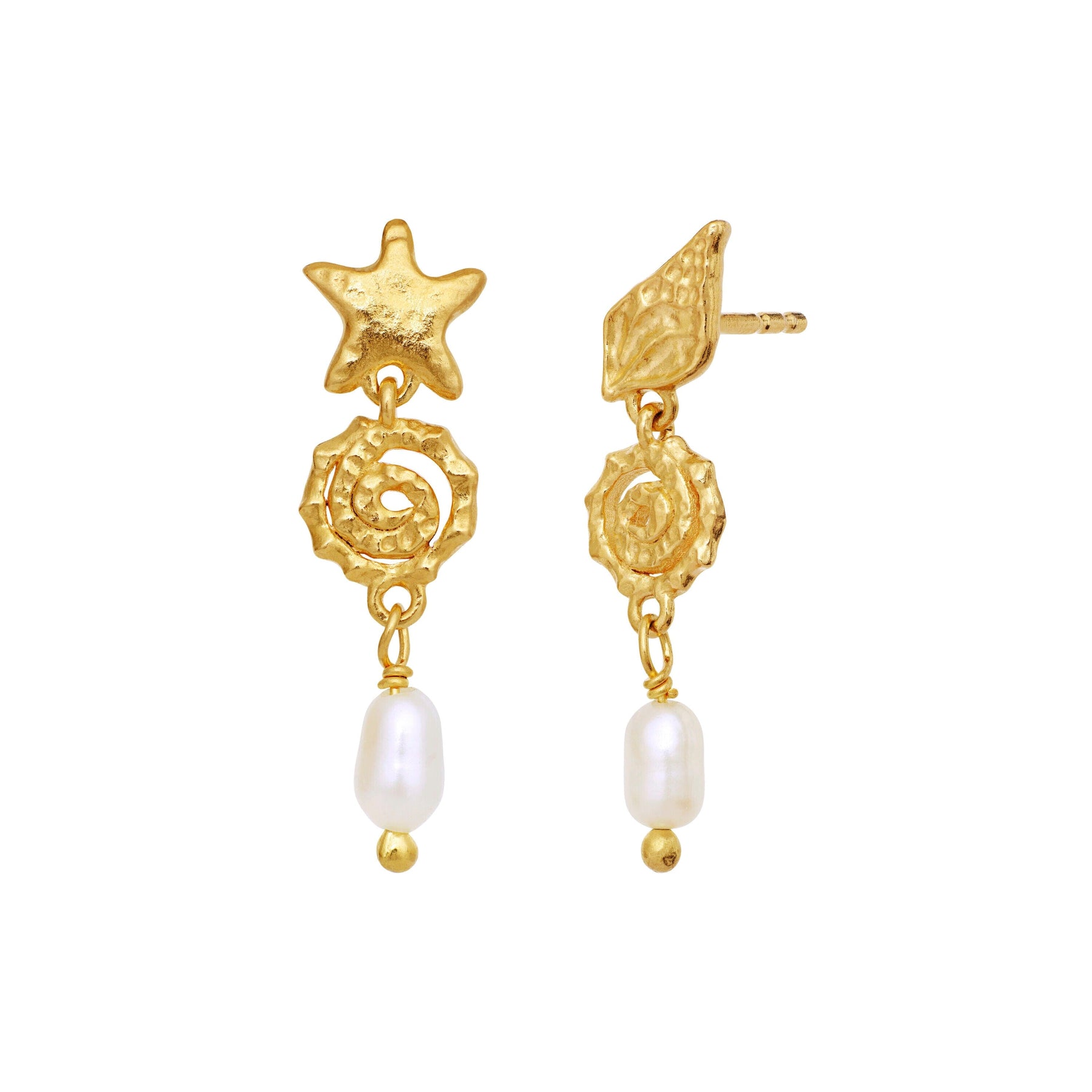 Örhängen från Maanesten med stjärnformad och bladformad topp. De har tvinnade detaljer i mitten och ovala pärlor som hänger längst ner.