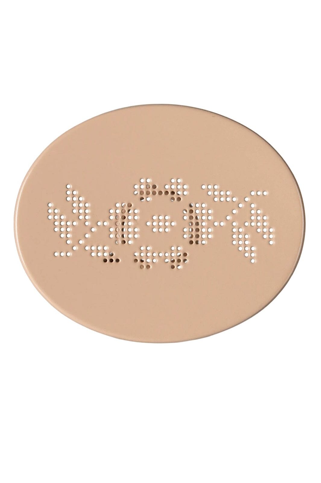 Den rosa metallen har ett fint hålmönster på både bord och bänk. De små hålen skapar ett lätt och luftigt uttryck.