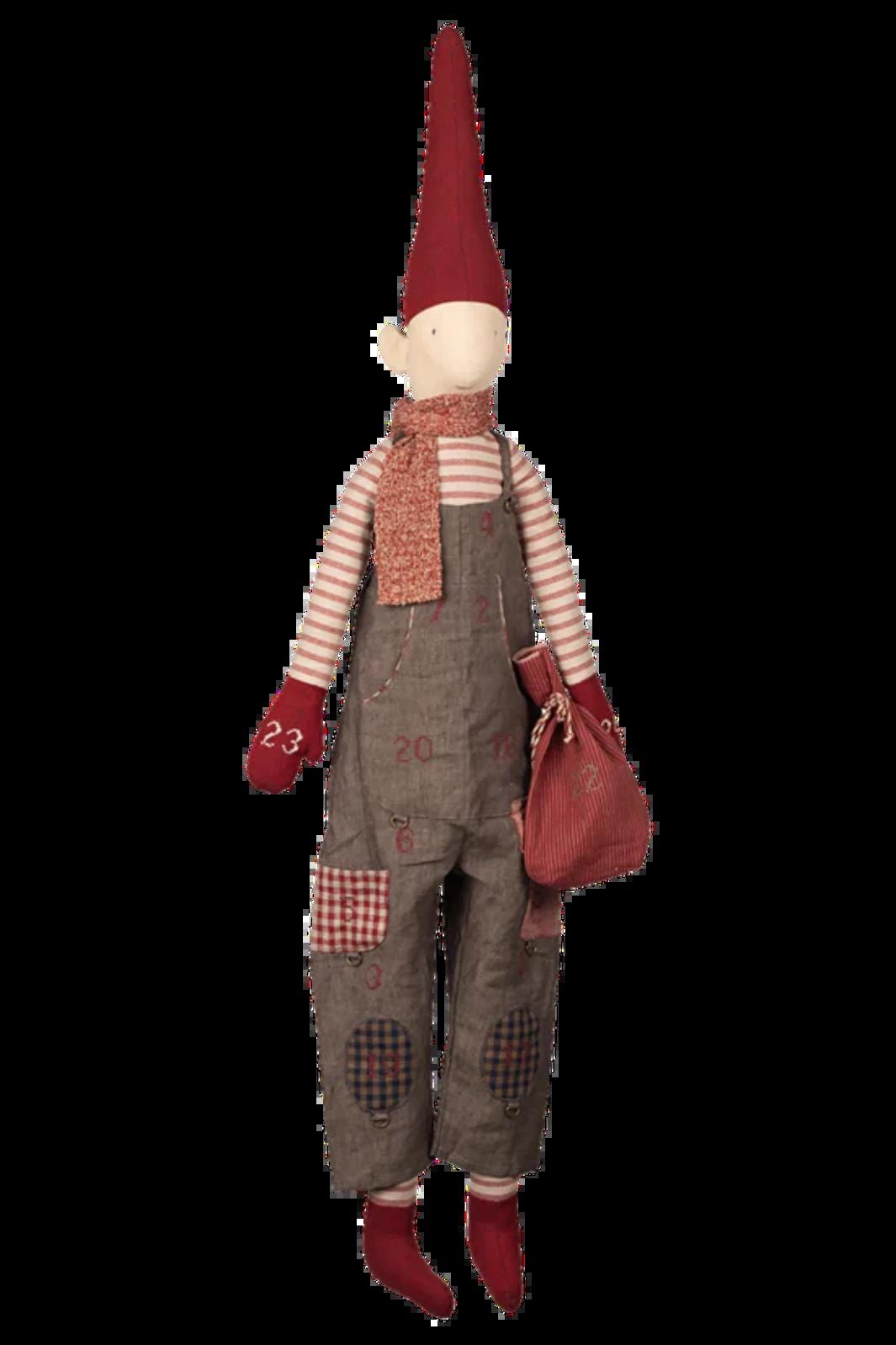 Grå kalendernisse från Maileg med randig tröja och overall med tal. Den 121 cm höga nissen har en röd mössa och kan hängas upp med stroppen i nacken.