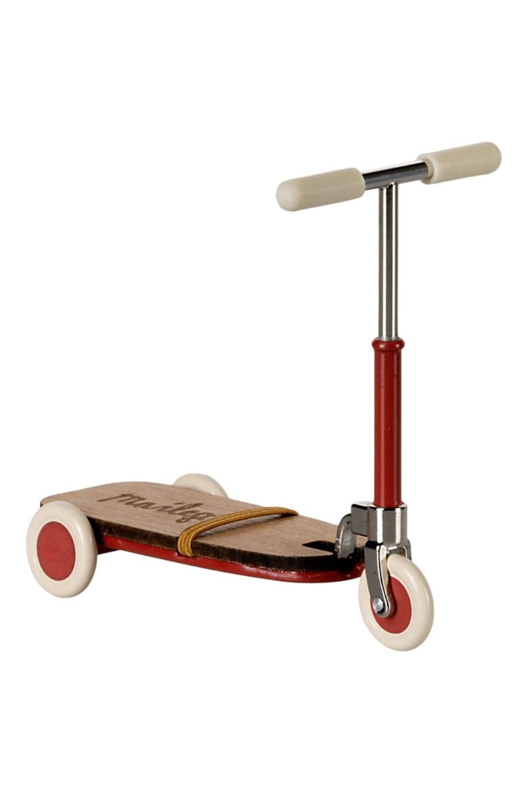 En röd sparkcykel från Maileg med träplatta och metallram. Styret har magneter för att hålla en mus på plats, medan ett gummiband på plattan säkerställer stabil körning.