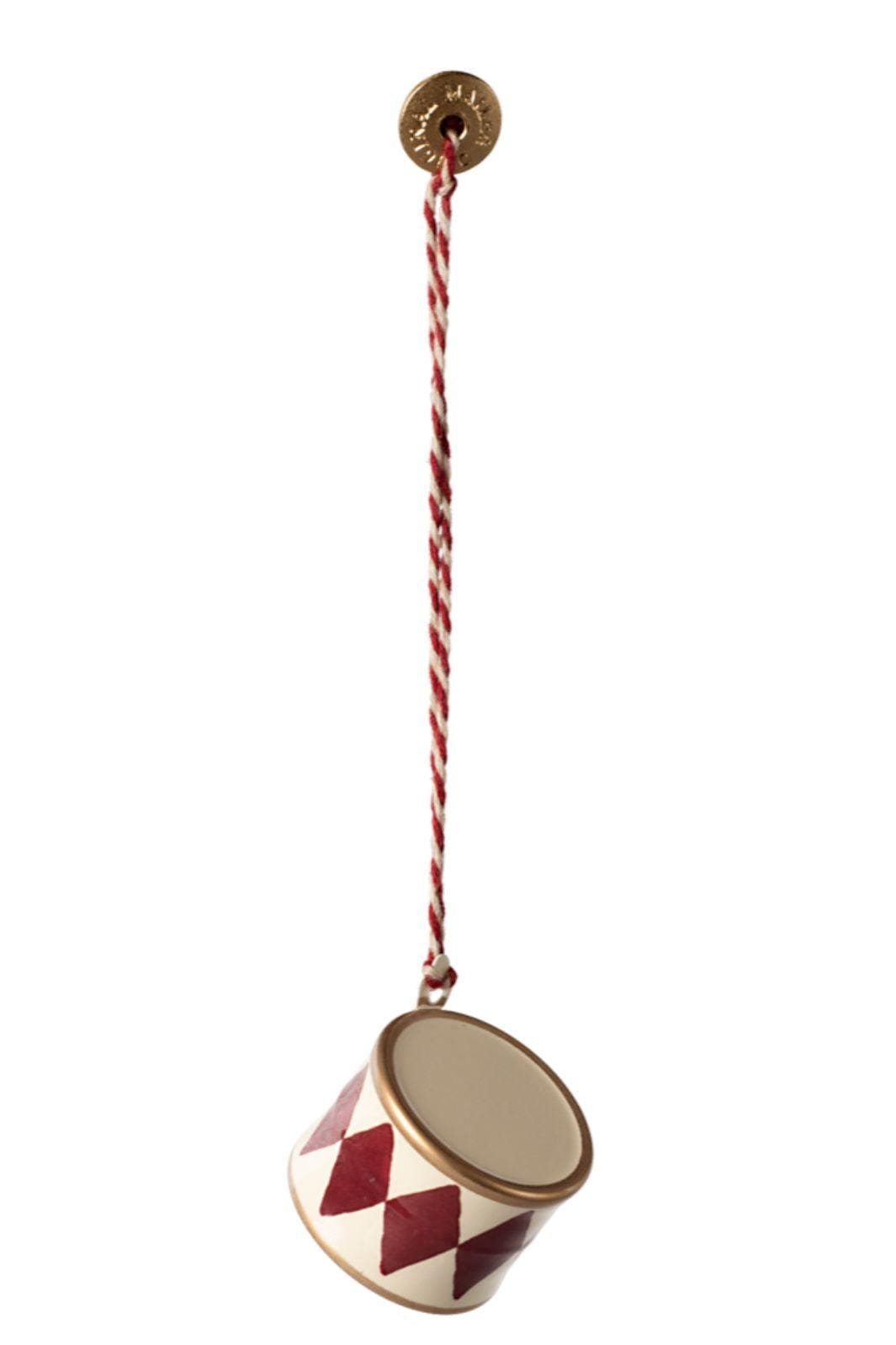 Litet metallhänge i trumform från Maileg med rött och vitt diamantmönster. Tillverkat av metall med handmålade detaljer och tvinnad upphängningssnodd.