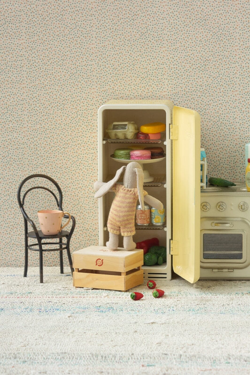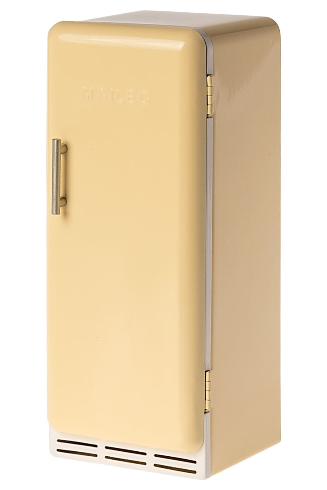En mini kylskåp i krämvit metall från Maileg med inbyggda hyllor och magnetlås. Kylskåpet har praktiska hyllor inuti och en solid konstruktion för lek.