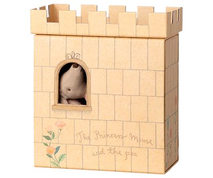 Ett leksaksset från Maileg med en musdocka i mönstrad klänning, en minisäng med flera lager filtar och en pappkartong utformad som ett torn med fönster.