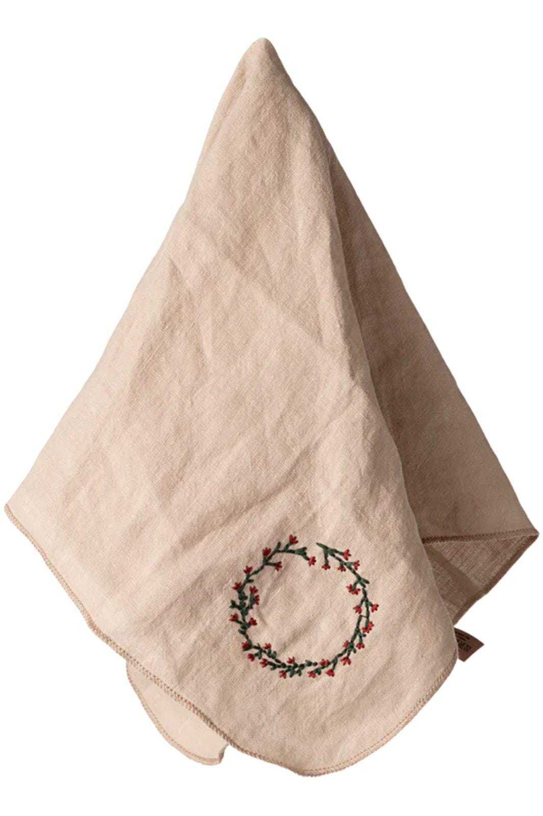 Beige tygservett från Maileg med broderad krans med gröna blad och röda blommor. Servetten är tillverkad av mjukt linne.