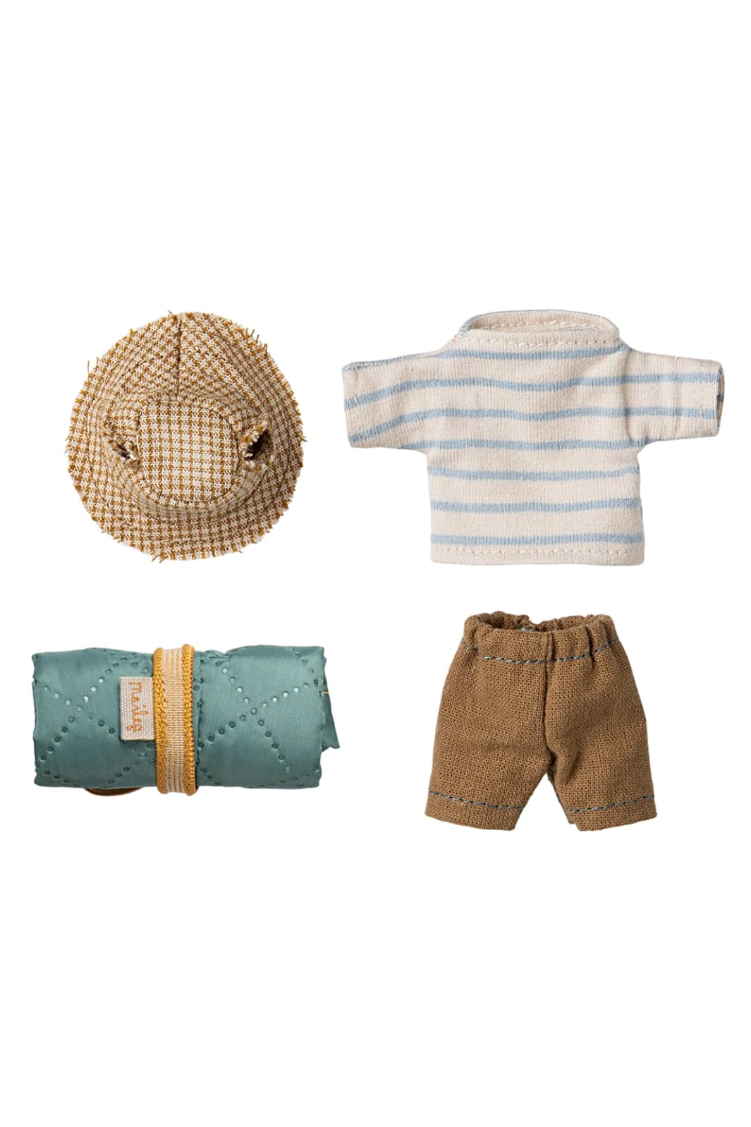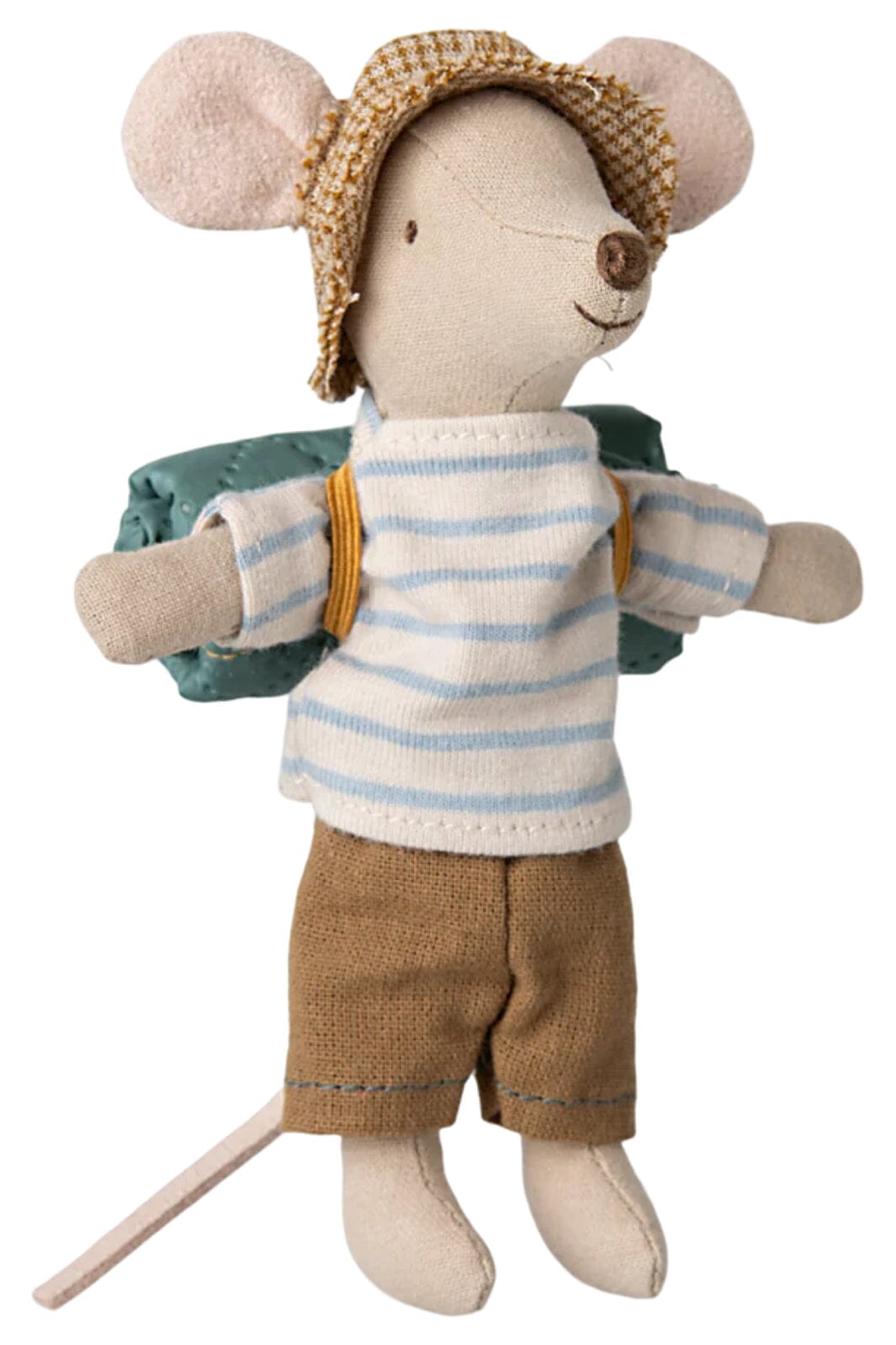 En mus av tyg från Maileg med randig tröja och bruna shorts. Musen kommer med en sovsäck och har magneter i händerna för lek. Tillverkad av bomull och godkänd för alla åldrar.