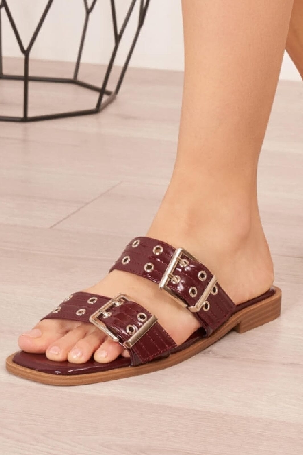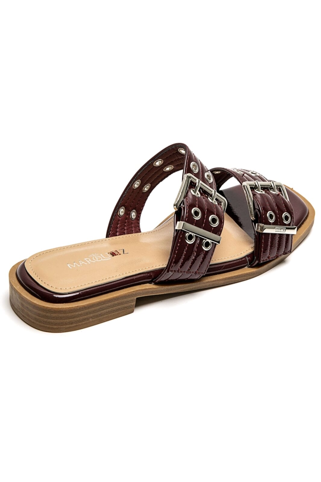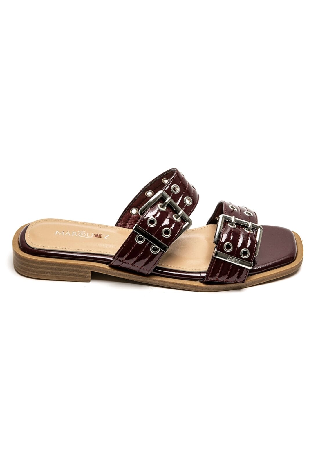Sandaler från Marta Du Chateau i en djup röd nyans. Två breda remmar med spännen ger möjlighet att justera passformen. Den platta sulan har en praktisk höjd.