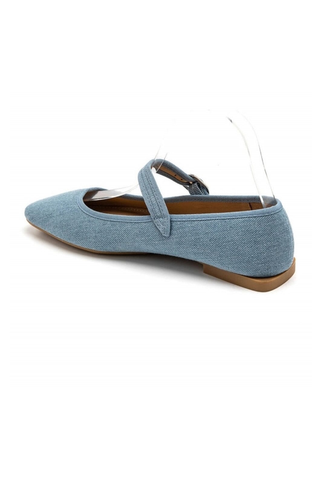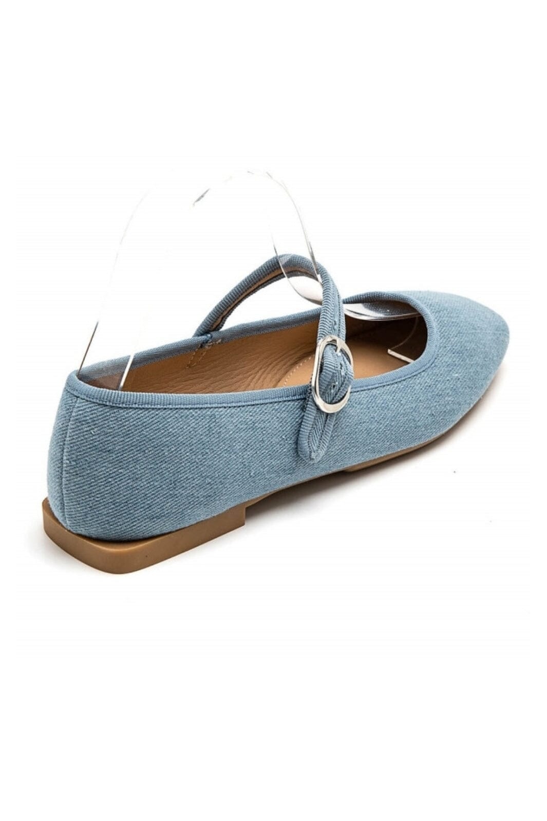 Ballerinaskor från Marta Du Chateau i ljusblå denimfärg. Skon har en Mary Jane-rem med spänne och fyrkantig tå, vilket ger den ett distinkt uttryck.