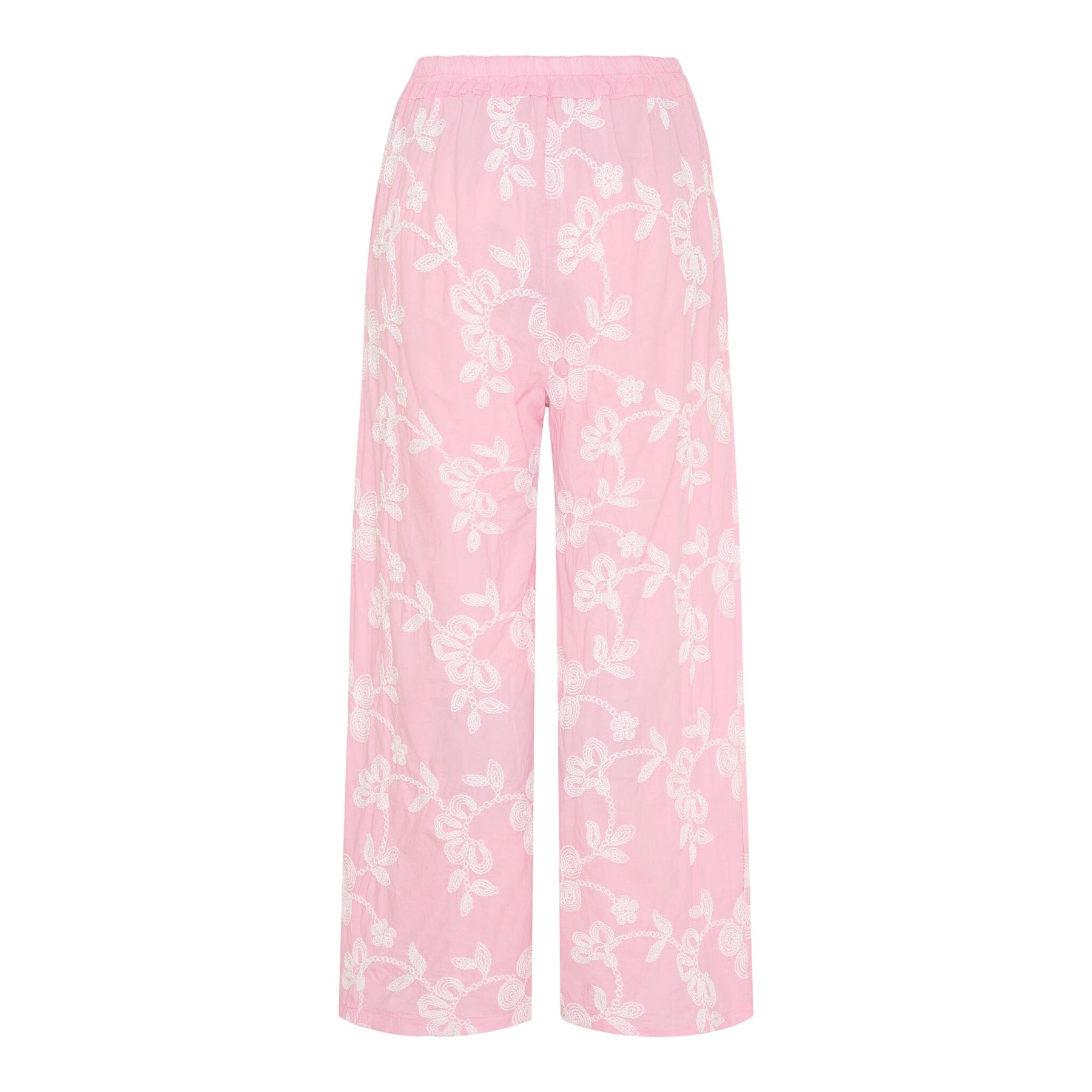 Rosa byxor från Marta Du Chateau med vitt blomsterbroderi. De långa benen har en bred skärning, och midjebandet är elastiskt för enkel av- och påtagning.
