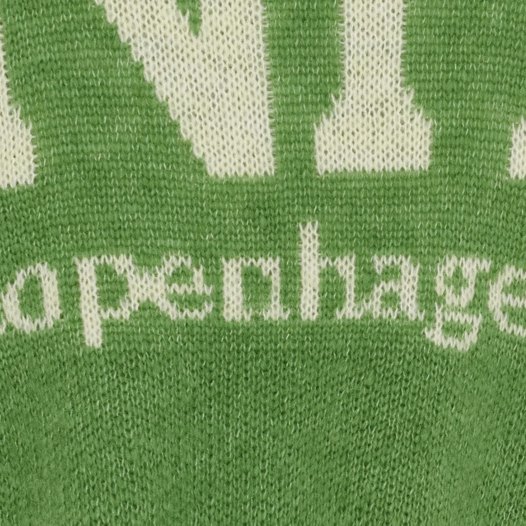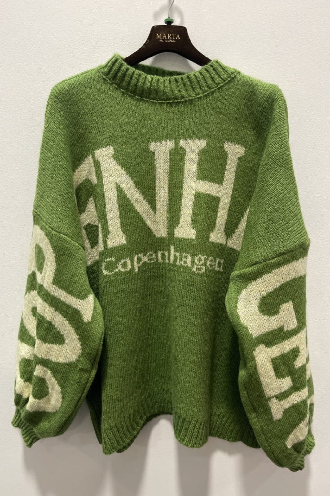 Grön stickad tröja från Marta Du Chateau med vit COPENHAGEN-print. Tröjan har en oversize passform och långa ärmar för avslappnad användning.