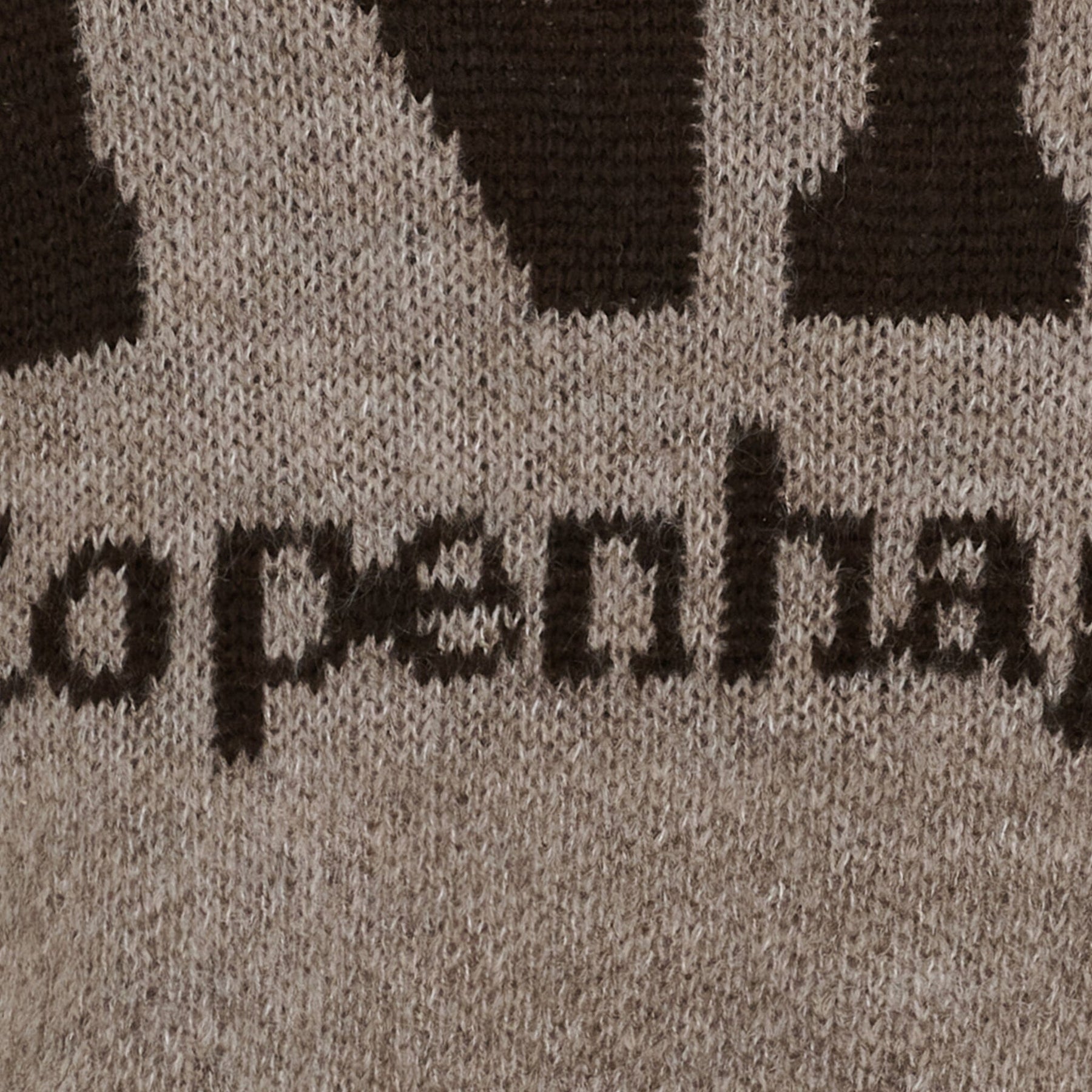 Stickad tröja från Marta Du Chateau i en mörkbrun nyans med stort Copenhagen-tryck på framsidan och ärmarna. Tröjan har en oversized passform och en rund halsringning.