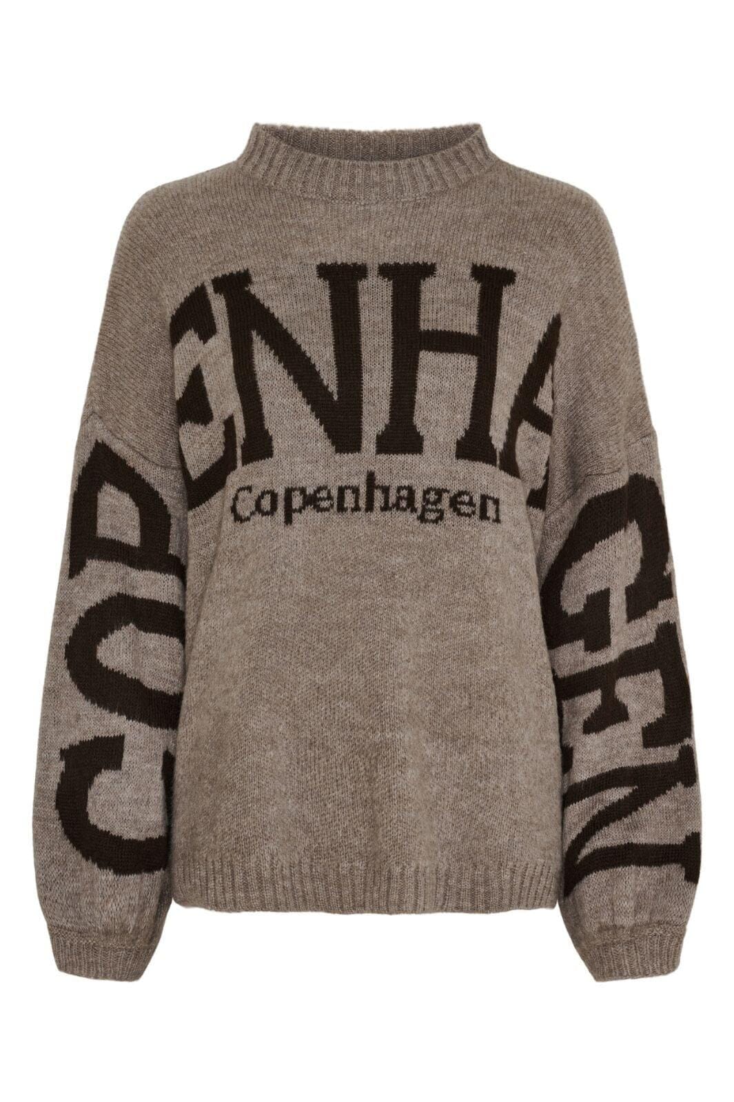 Stickad tröja från Marta Du Chateau i en mörkbrun nyans med stort Copenhagen-tryck på framsidan och ärmarna. Tröjan har en oversized passform och en rund halsringning.