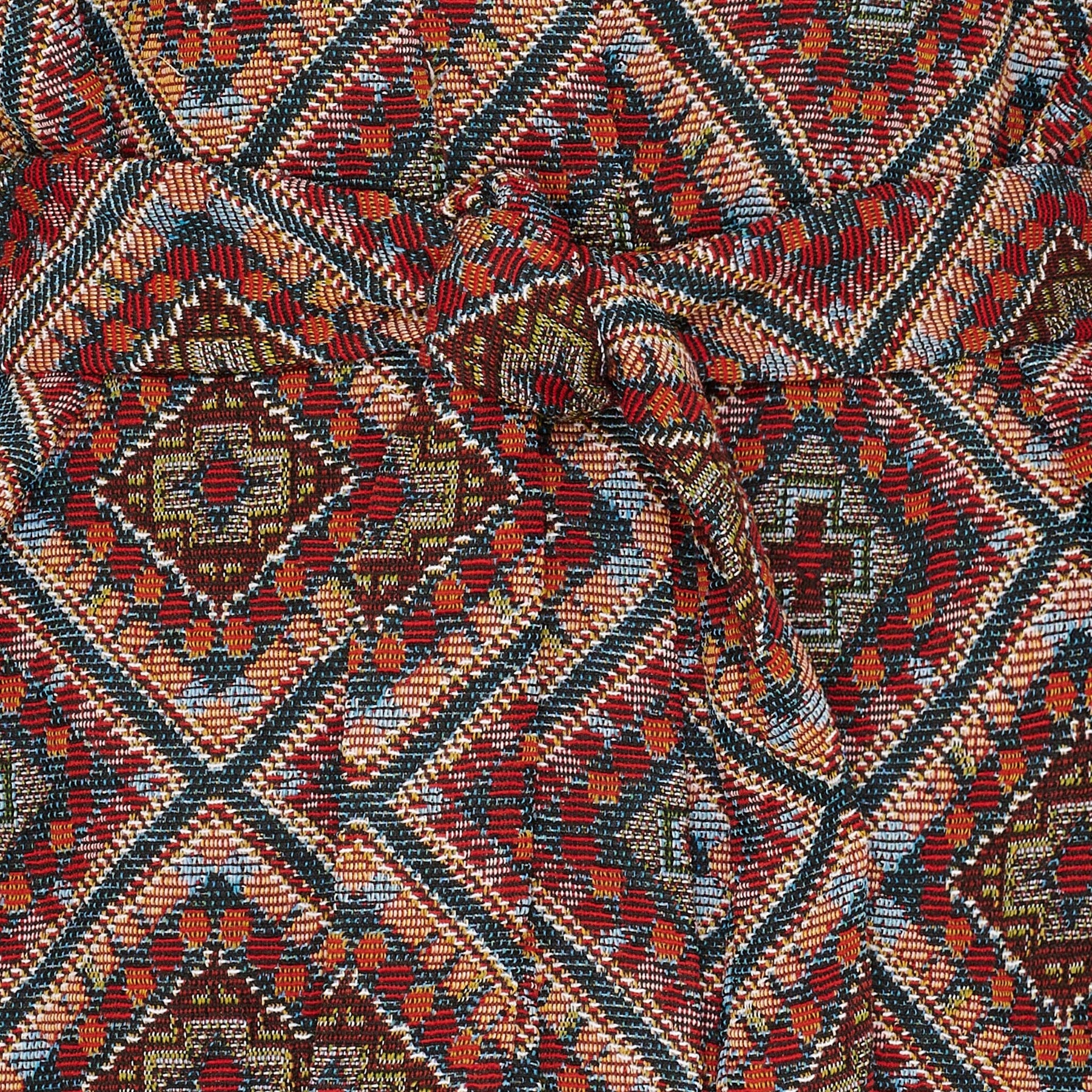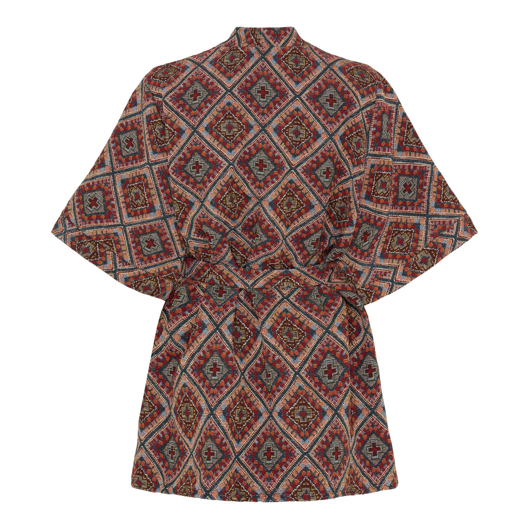 Kimono från Marta Du Chateau med geometriskt mönster i burgunder, marinblå och orange nyanser. De breda ärmarna och den lösa passformen ger en avslappnad känsla med god rörelsefrihet.