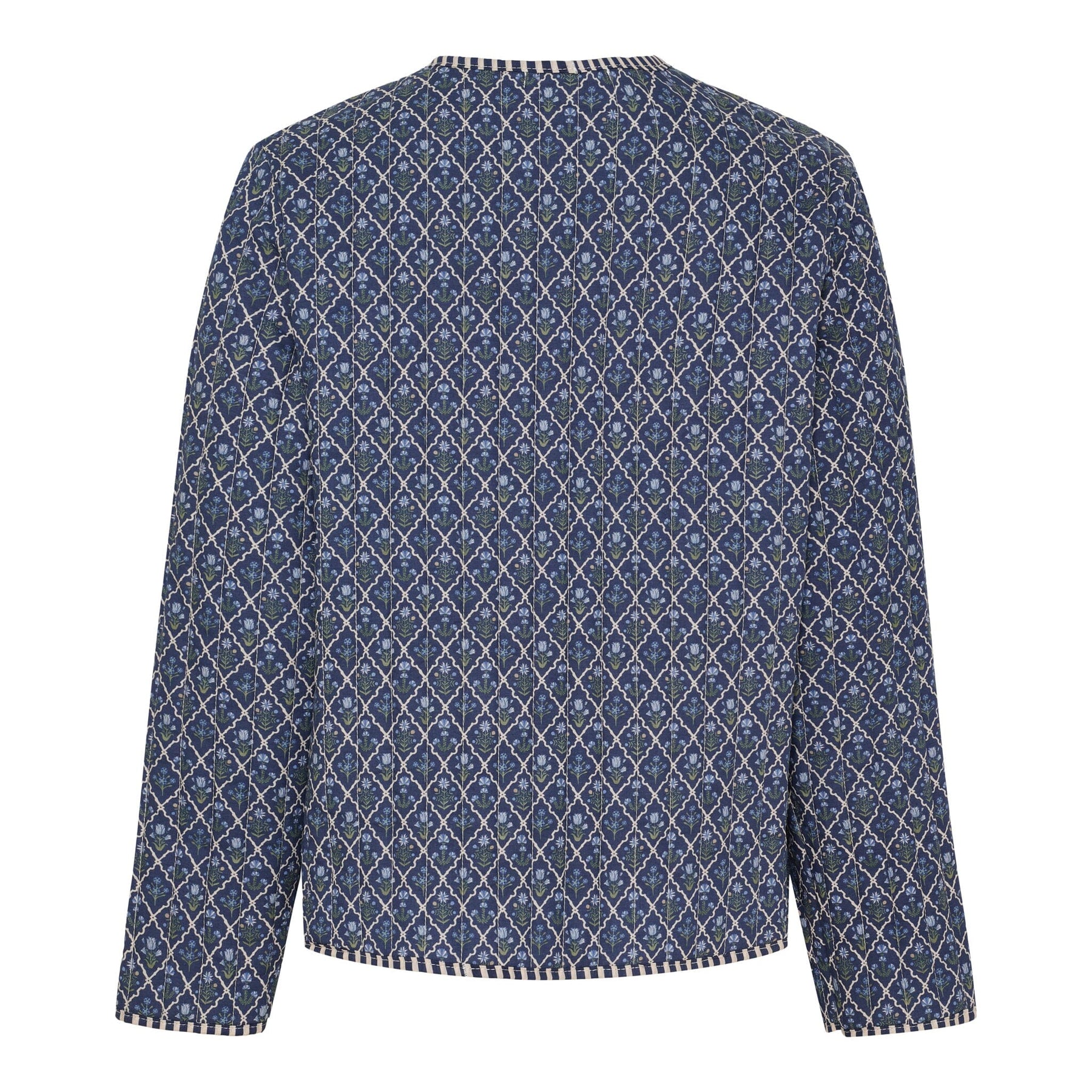 Mörkblå jacka från Marta Du Chateau med rutmönster och dekorativa sömmar. Den har rund halsringning, knappstängning fram och två praktiska framfickor med kontrastmönster.