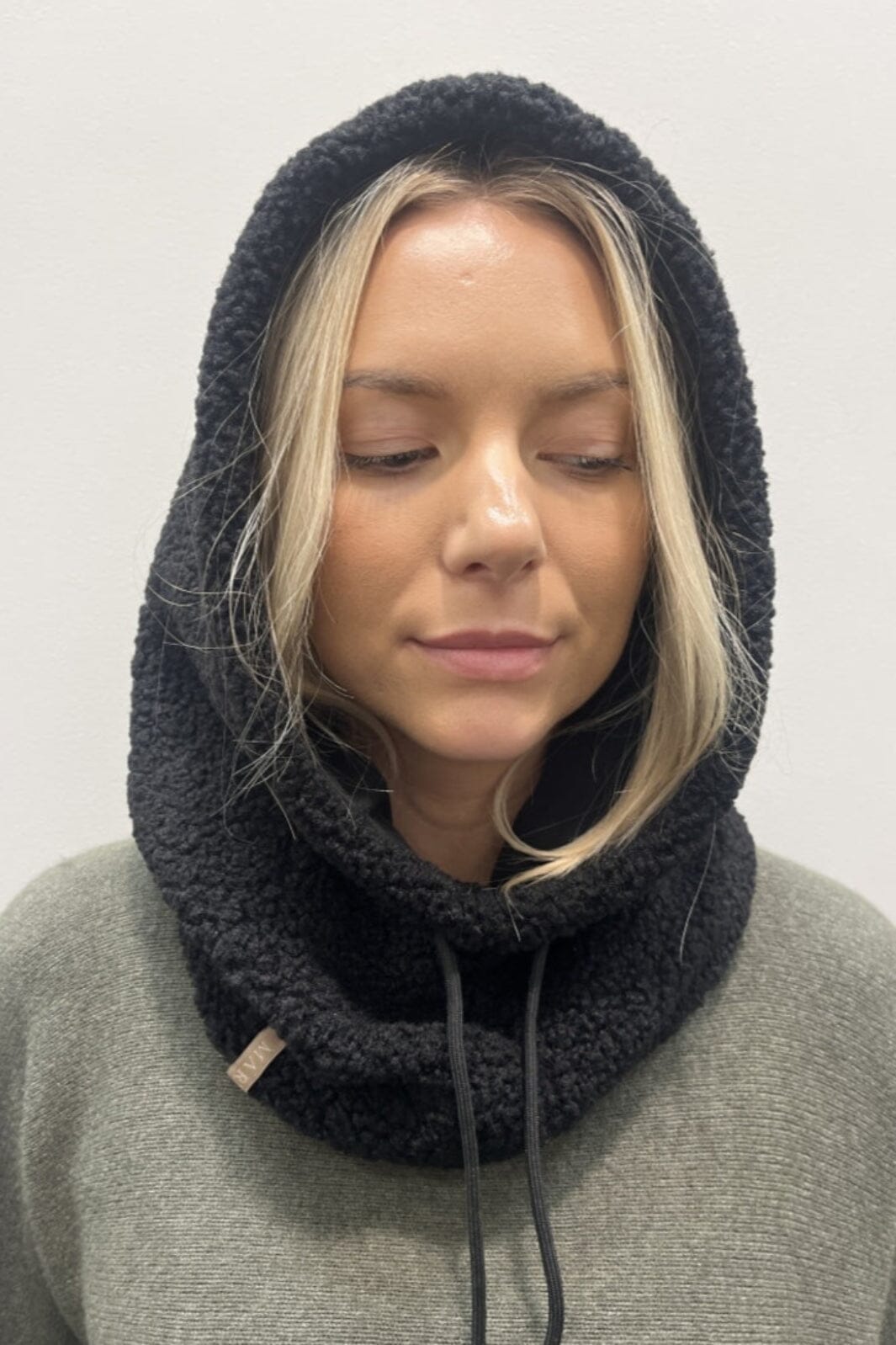 Svart balaclava från Marta Du Chateau med en mjuk, fluffig yta. Den har en praktisk snodd i botten för justering av passformen och täcker både huvud och hals.
