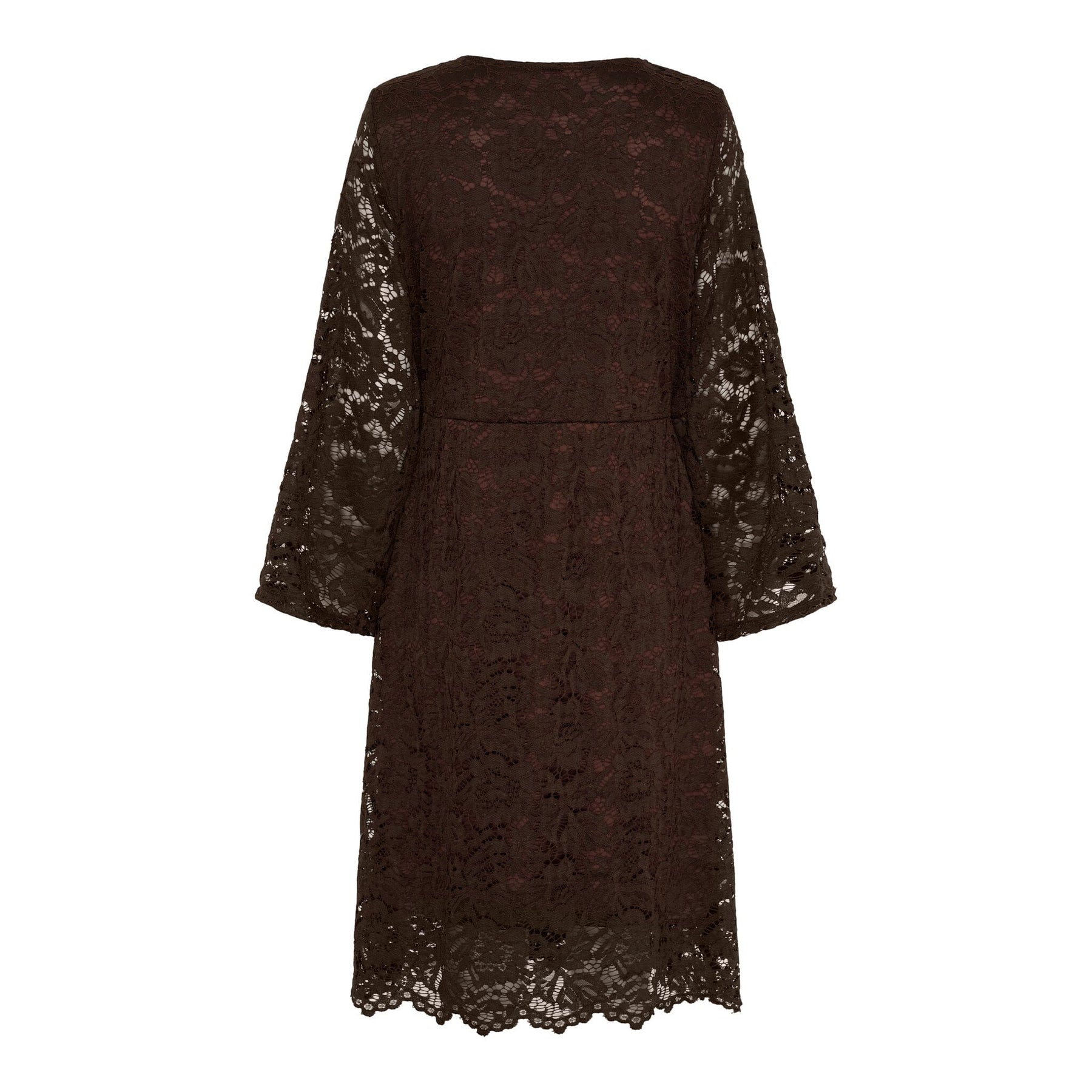 Brun knälång klänning från Marta Du Chateau med spetsyta. Klänningen har V-ringning och 3/4-ärmar samt knytband i sidan, vilket ger en slankande passform.