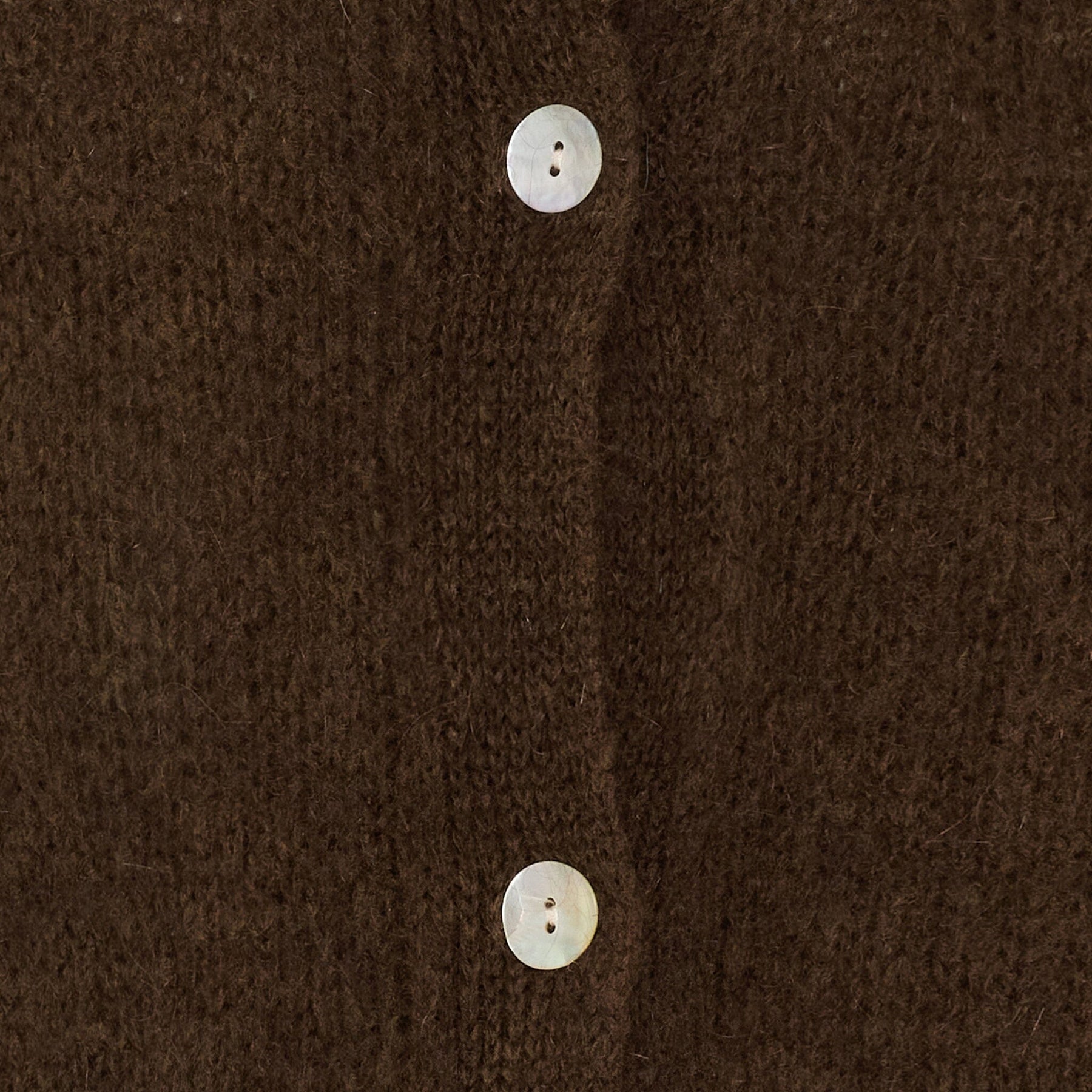 Brun stickad kofta från Marta Du Chateau med rund halsringning. Koftan har knappar framtill och är gjord av en mjuk blandning av mohair och ull.