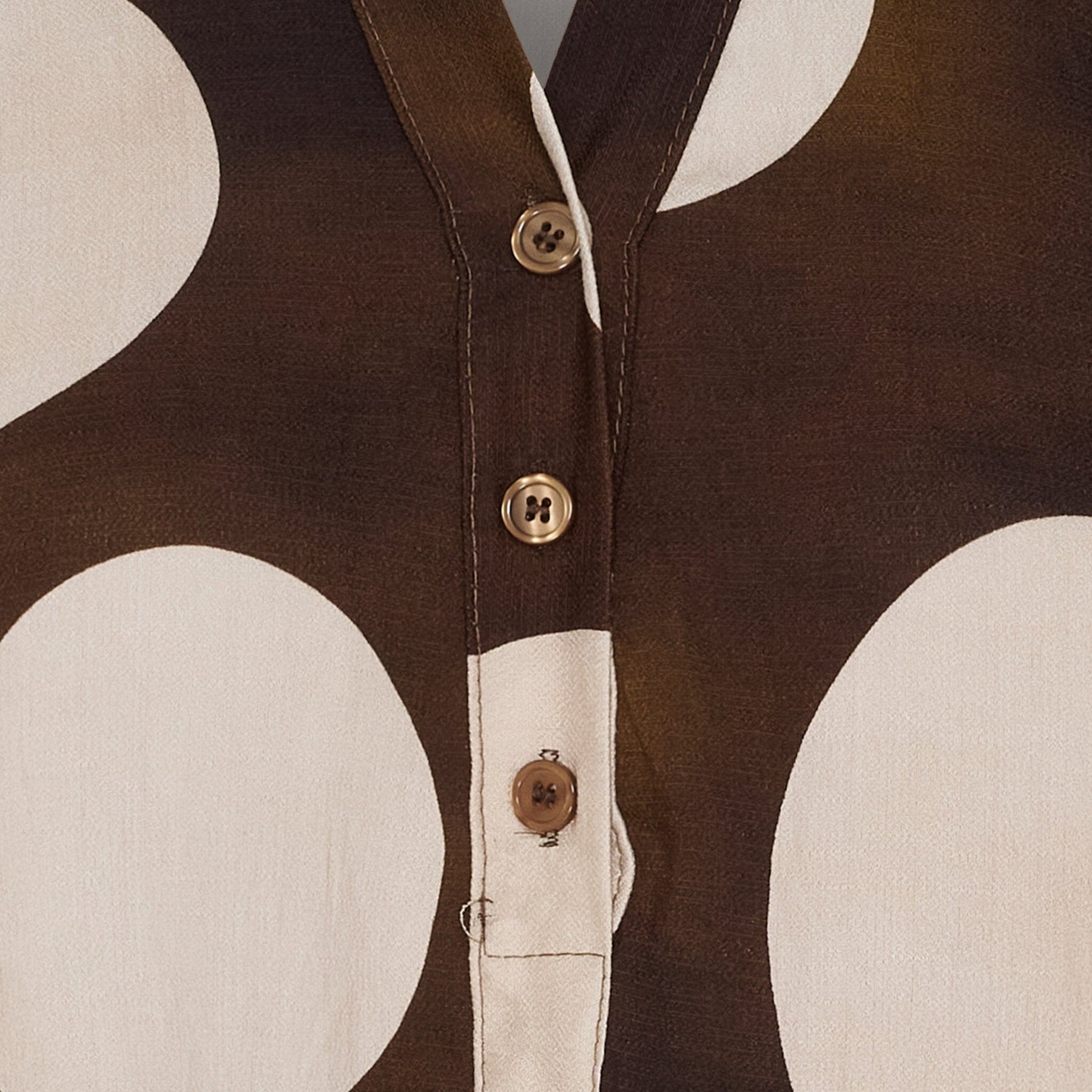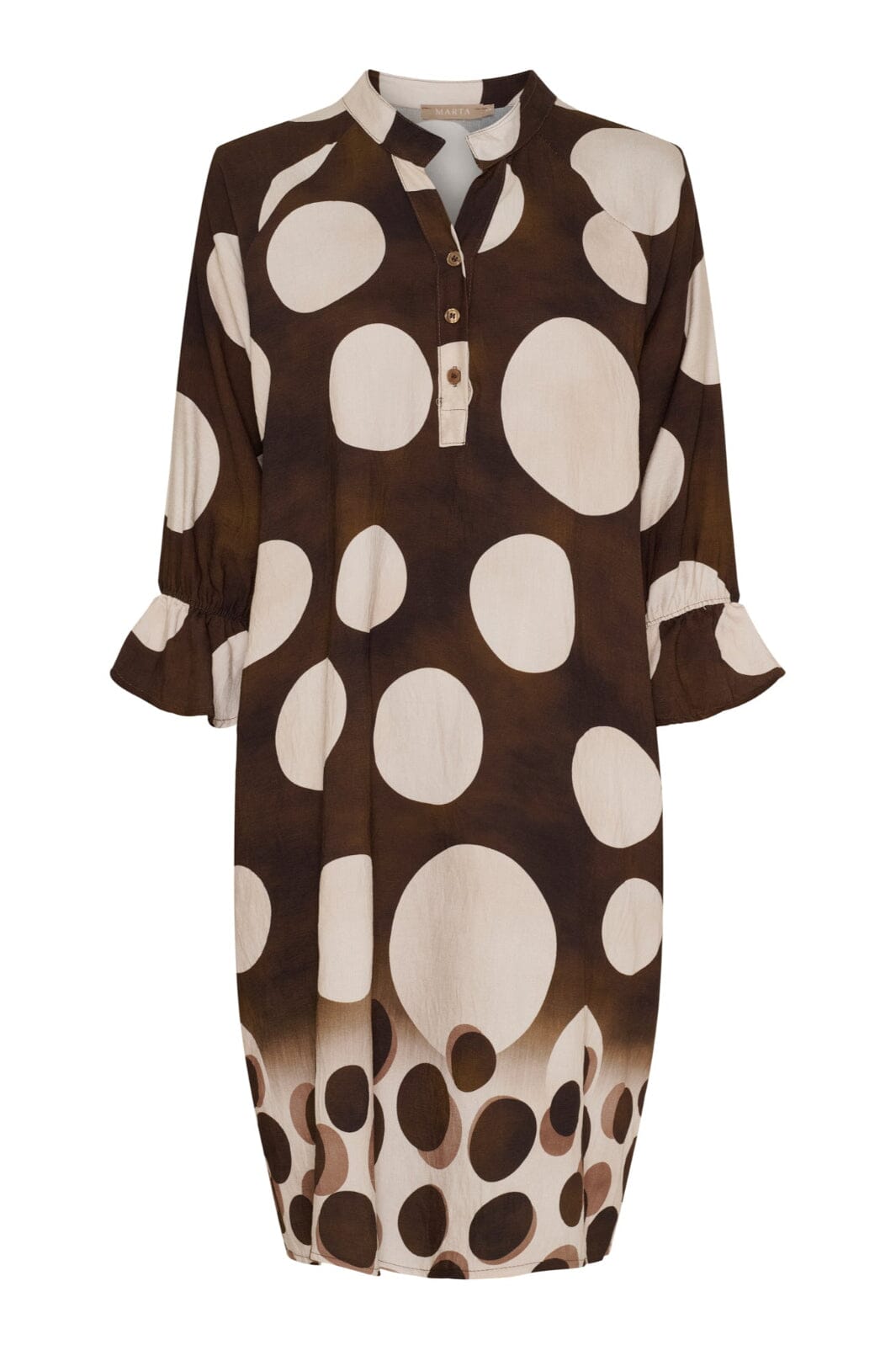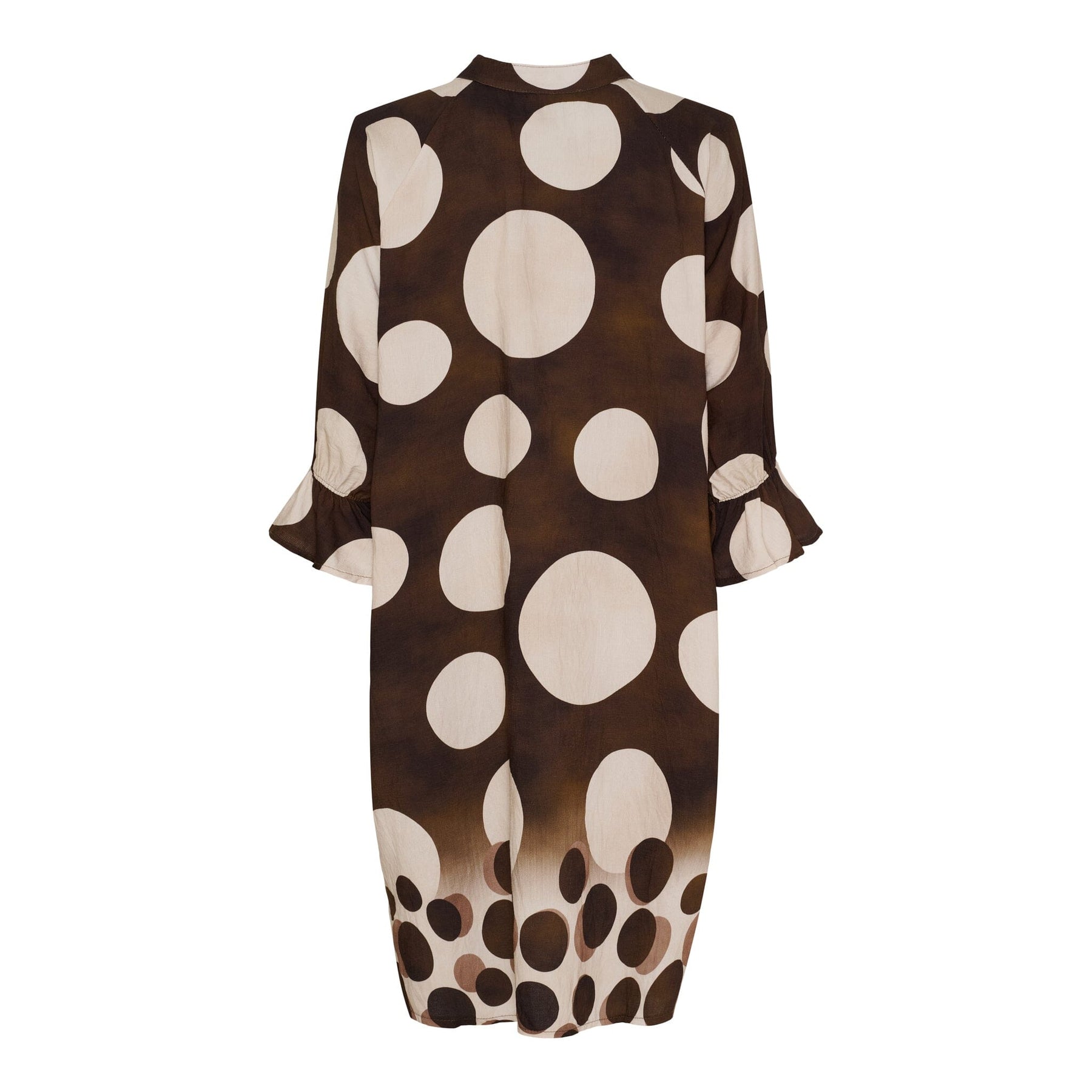 Brun klänning från Marta Du Chateau med stora, ljusa prickar på mörk botten. Klänningen har skjortkrage och 3/4-ärmar med volangdetaljer vid manschetterna.