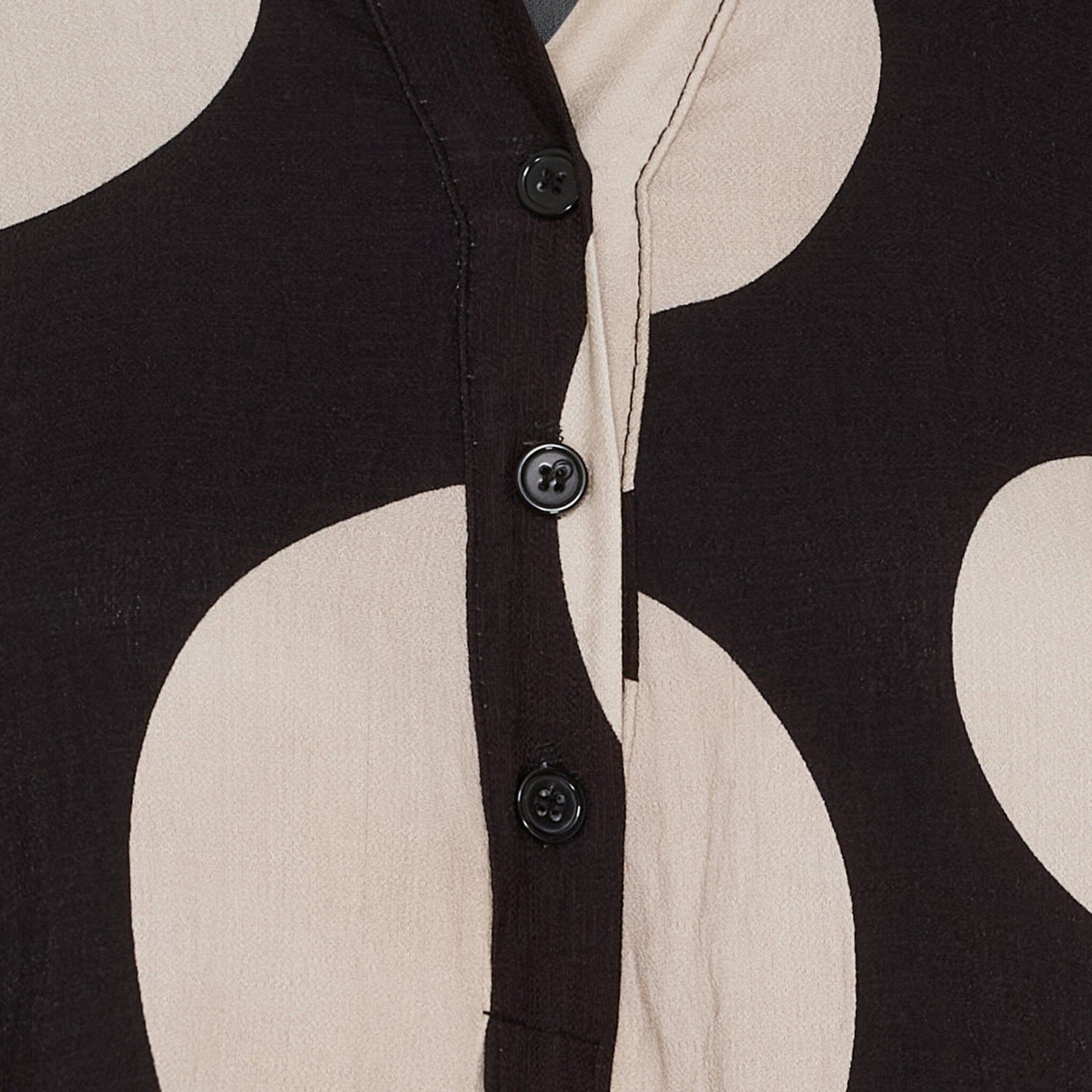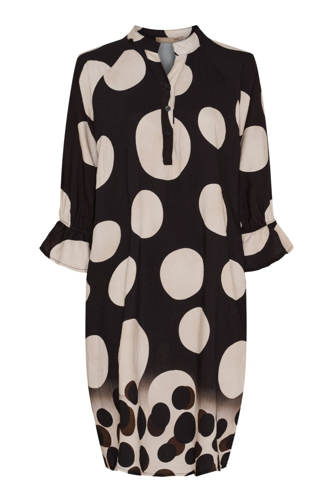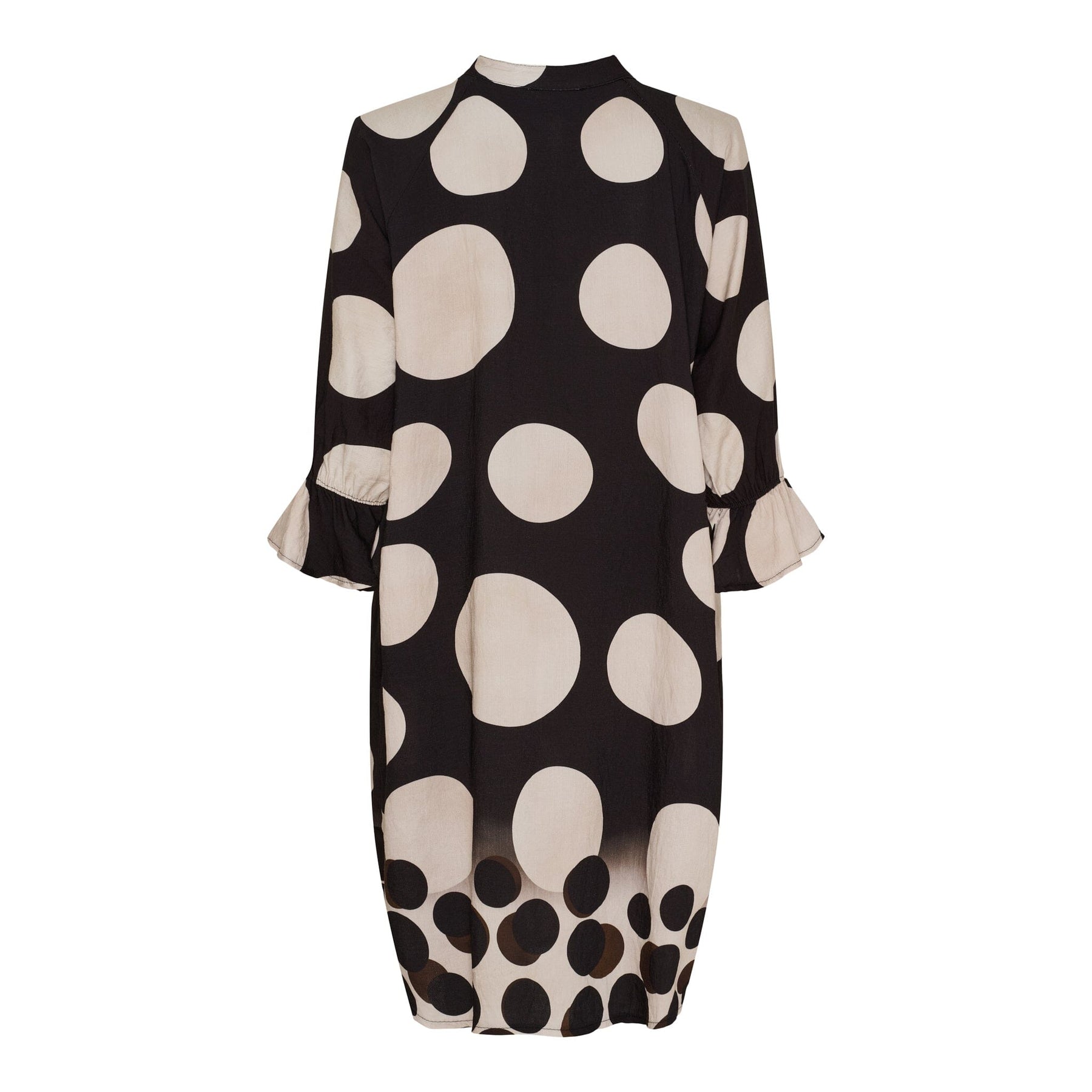 Svart klänning från Marta Du Chateau med stora beige prickar. Klänningen har en lös passform och går till knäet. Den är gjord med trekvartsärmar och en skjortkrage med knappar.