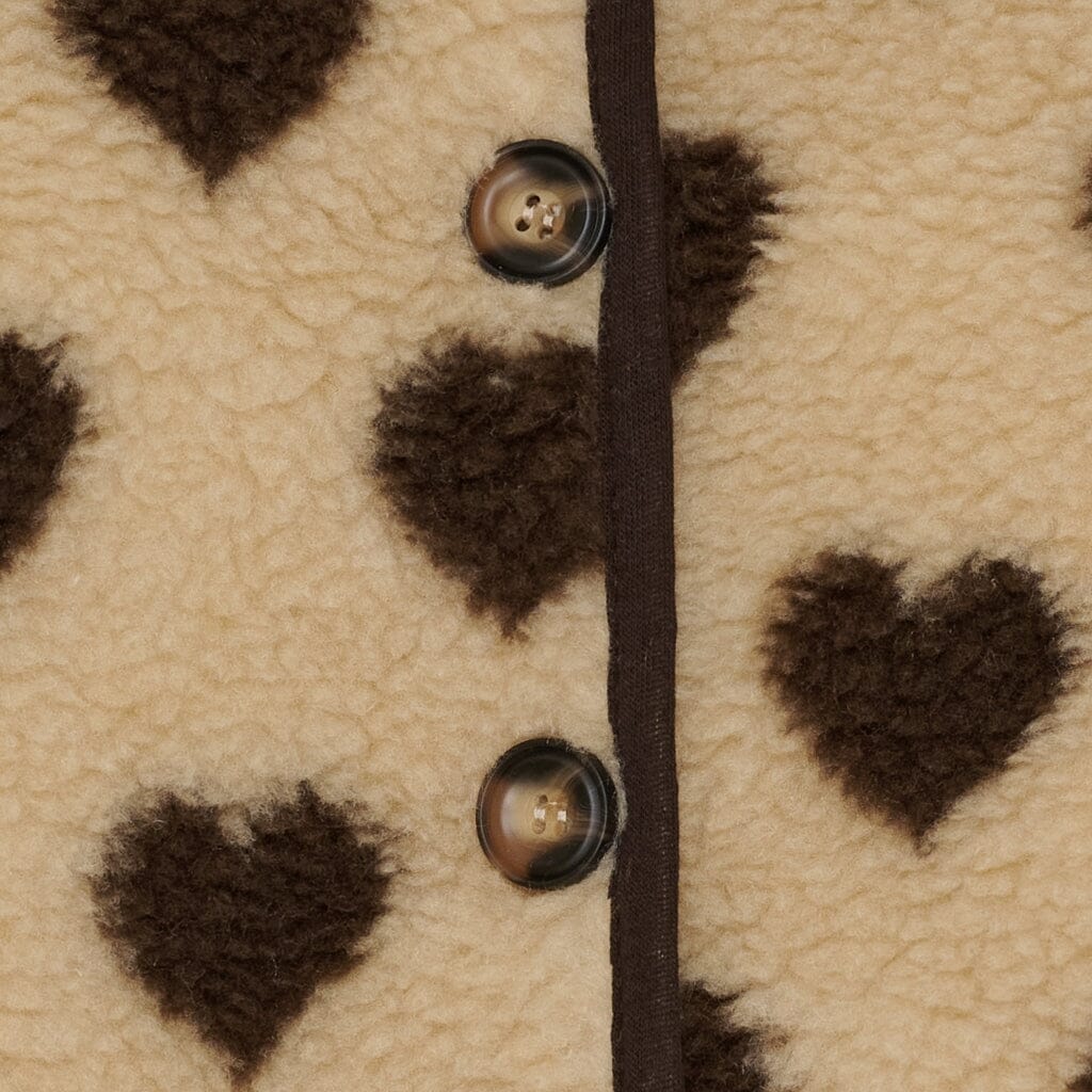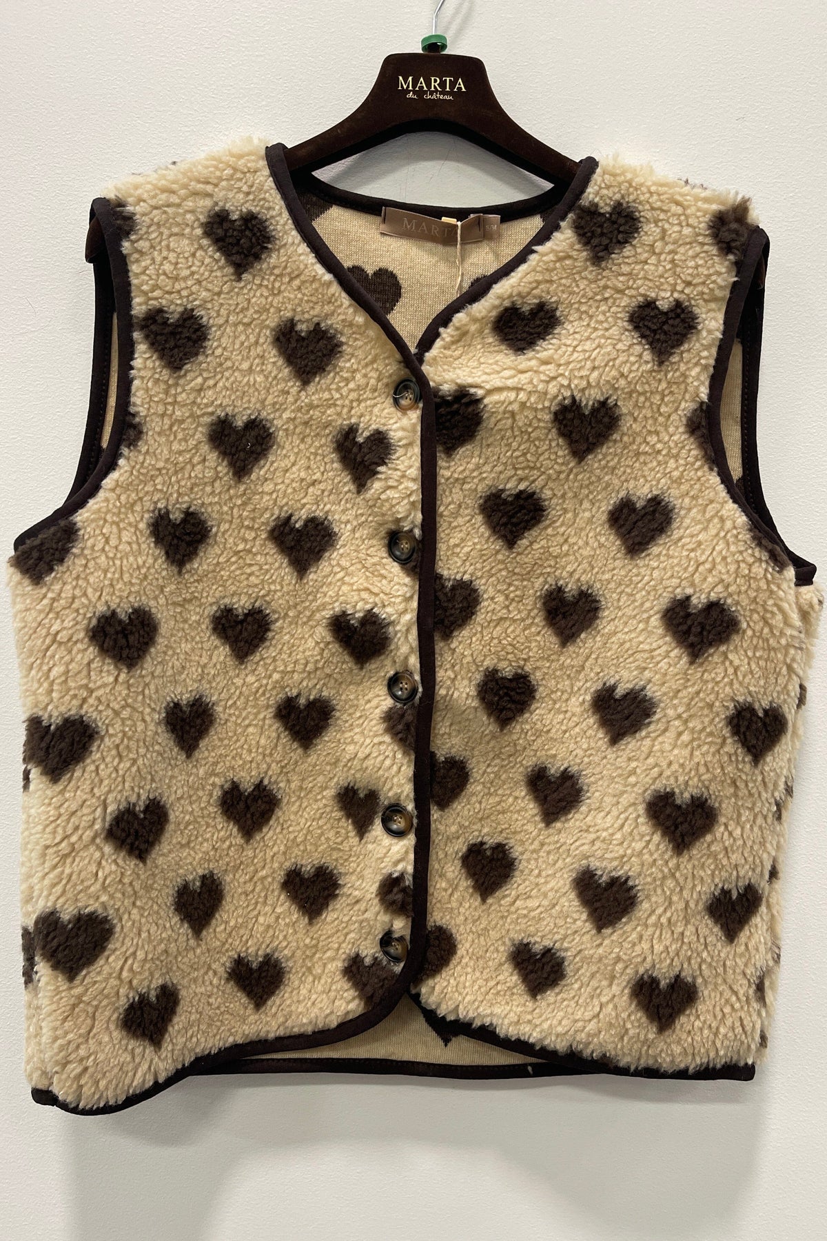 En väst från Marta Du Chateau med ett mönster av mörka hjärtan på en ljusbeige bakgrund. Västern har mörka kanter och en V-ringning.