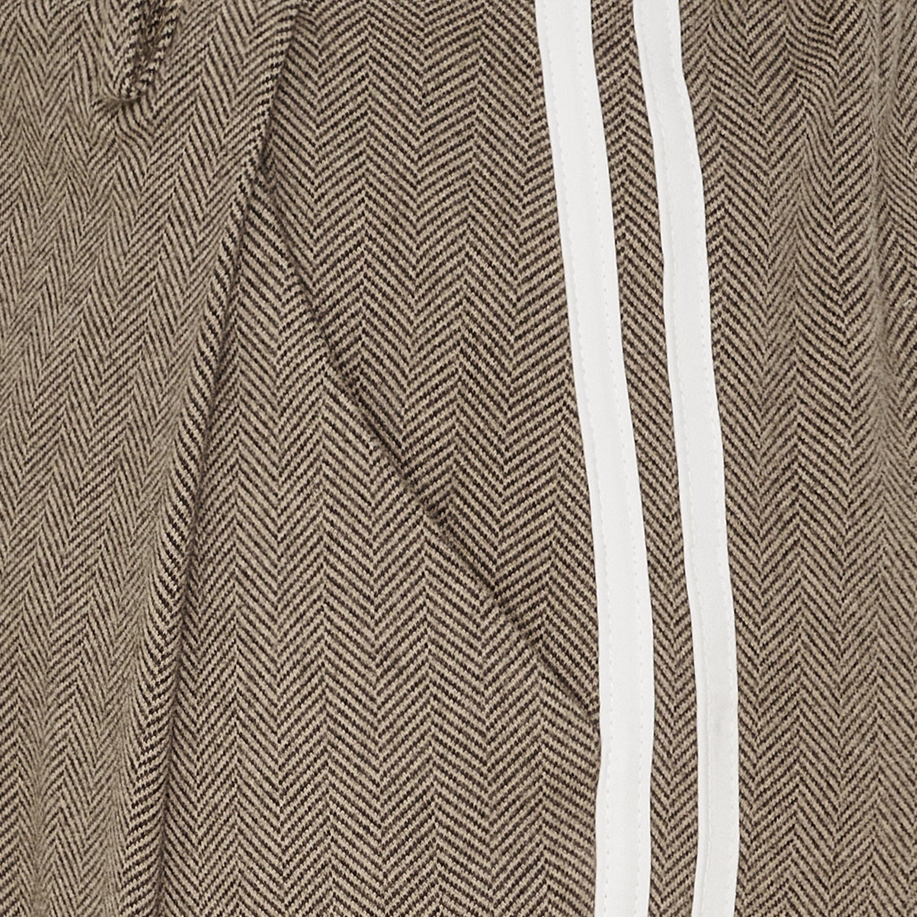 Bruna byxor från Marta Du Chateau med vita ränder längs benen. Byxorna har en lös passform och går till mitten av vaden. De har både dragkedja, elastik och knappar i midjan.