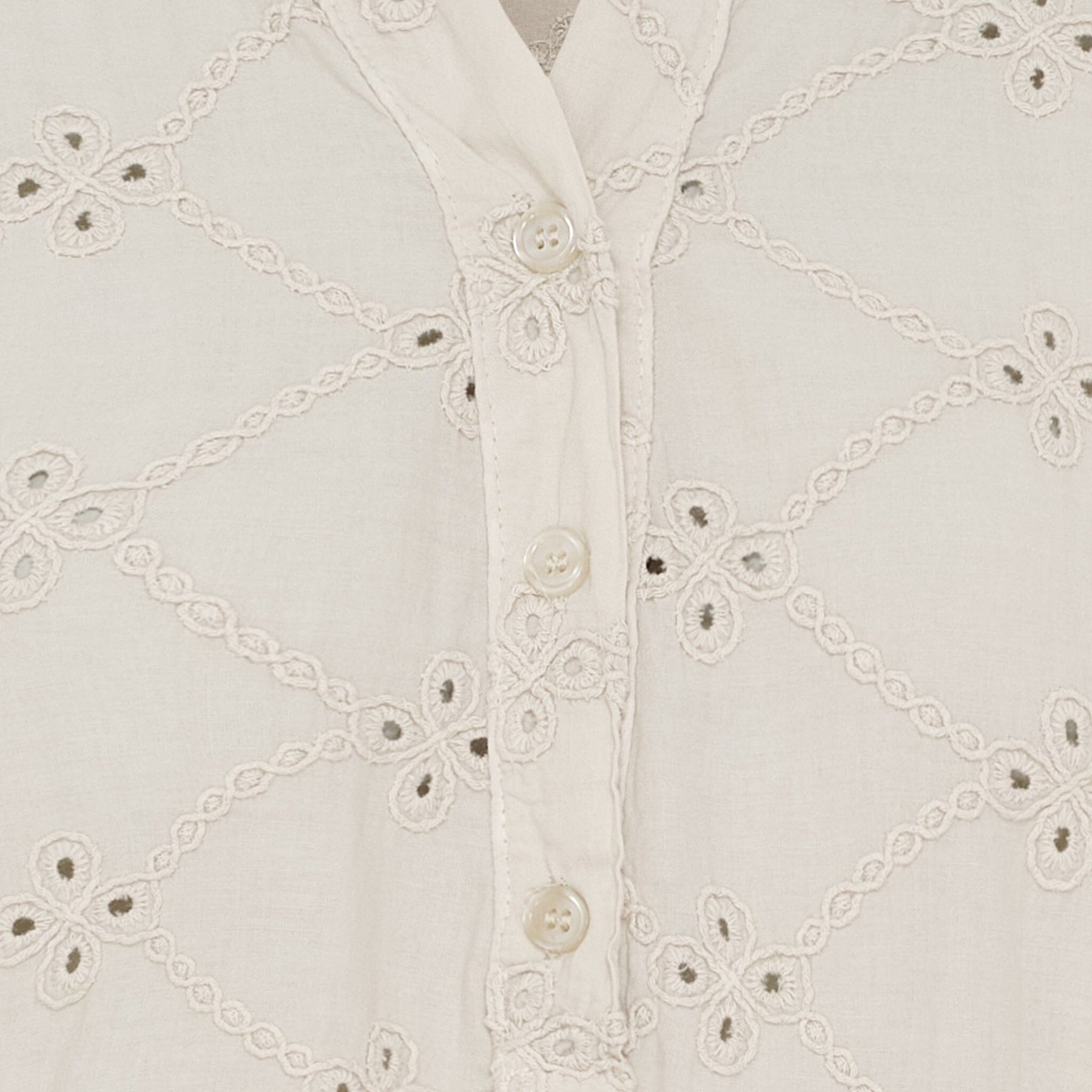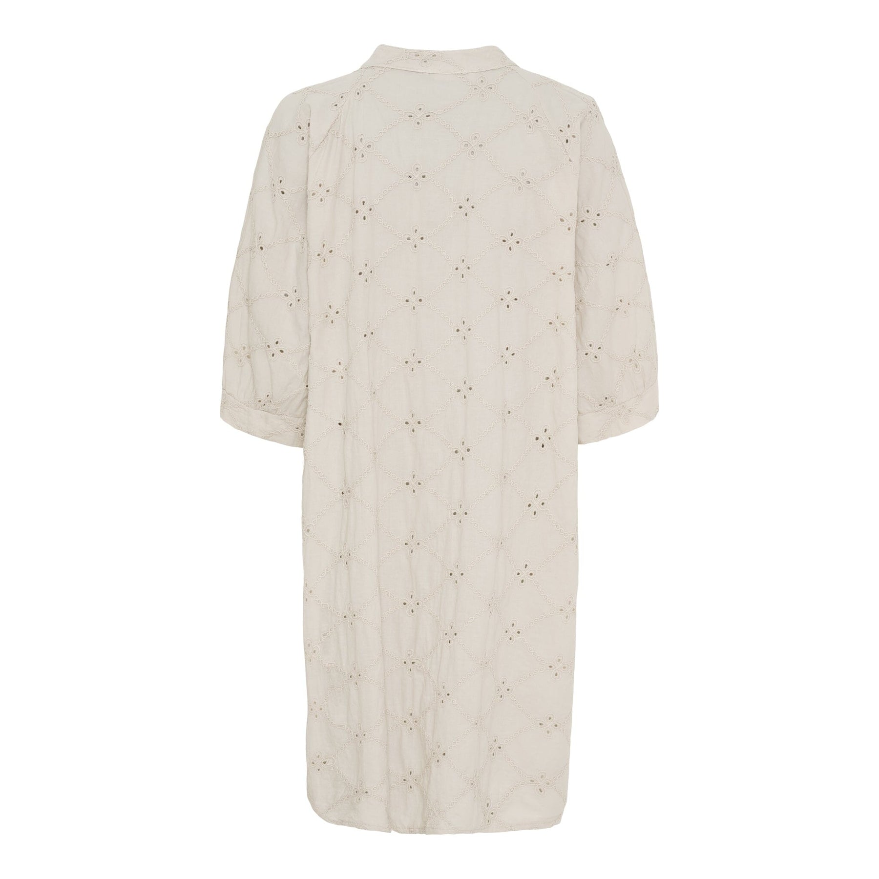 Beige klänning från Marta Du Chateau med broderat mönster och små utskärningar. Klänningen har en rund halsringning, knappar fram och 3/4-ärmar.