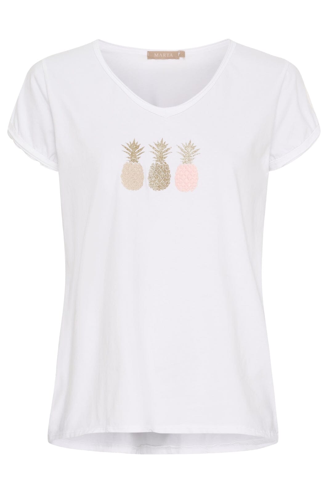 Vit t-shirt från Marta Du Chateau med v-ringning och rullade ärmar. På framsidan sitter tre glittrande ananasgrafiker i guld, beige och rosa, som ger t-shirten en somrig känsla.