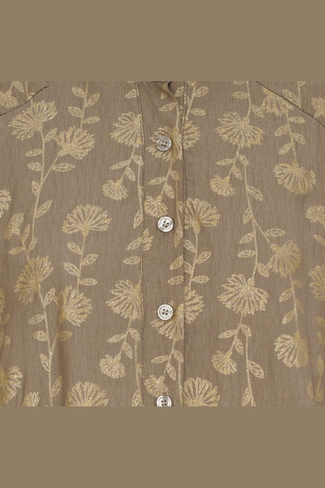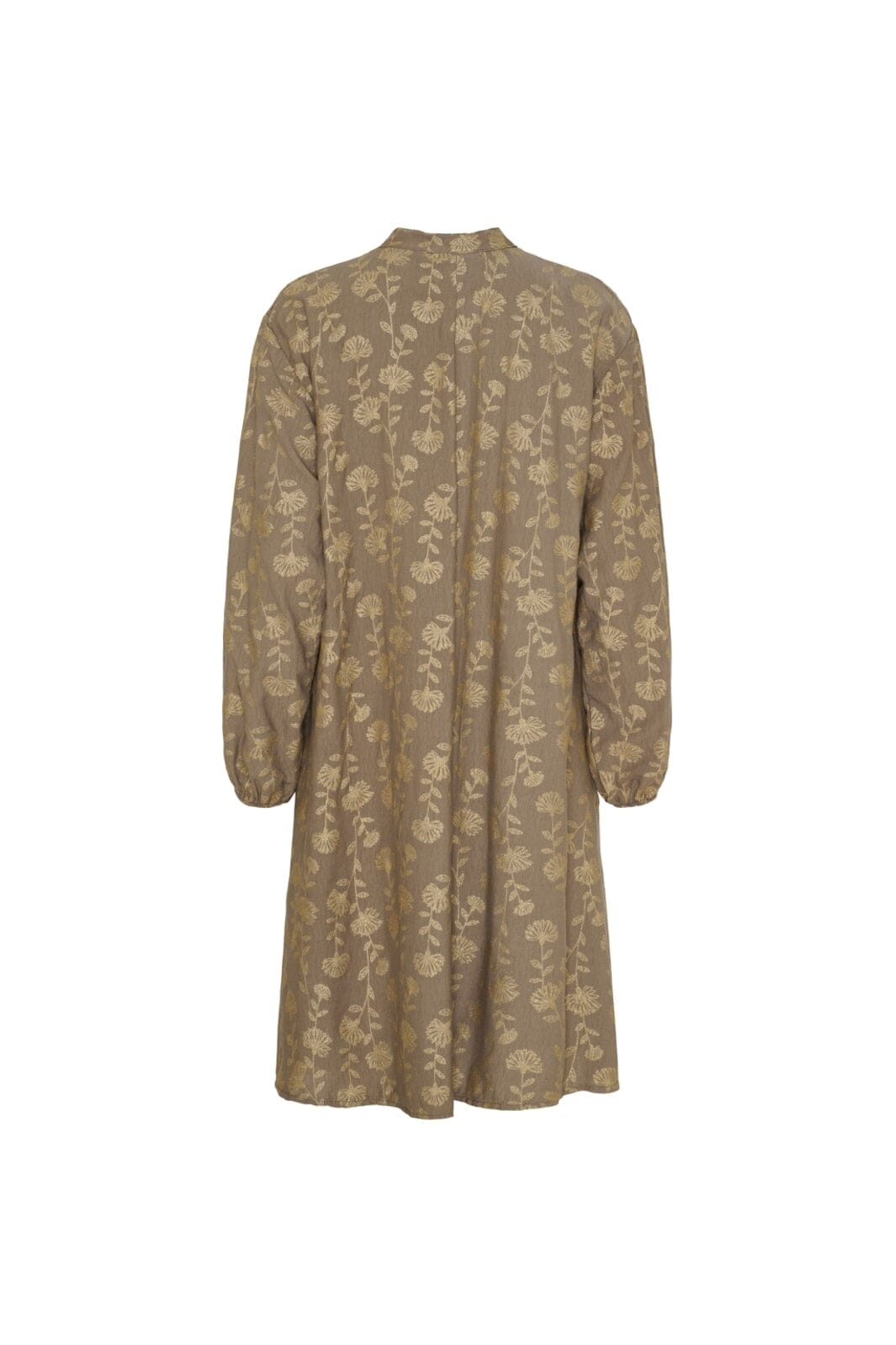 Knelång klänning från Marta Du Chateau i brunt med gyllene blommönster. Klänningen har långa ärmar med elastik och genomgående knapplåsning med en liten krage.