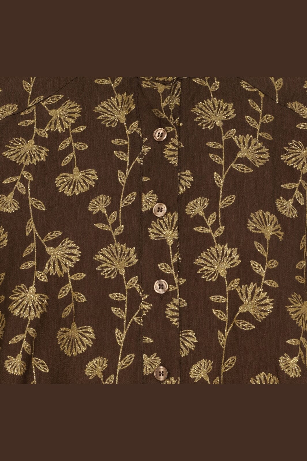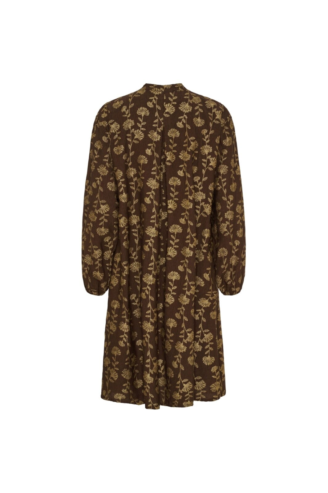 Brun klänning från Marta Du Chateau med gyllene blommönster. Klänningen har knappar hela vägen ner, skjortkrage och långa ärmar med elastik vid handlederna.